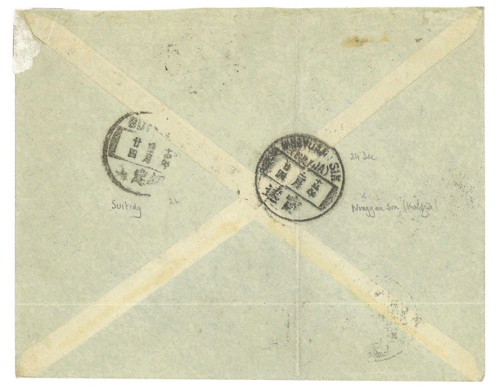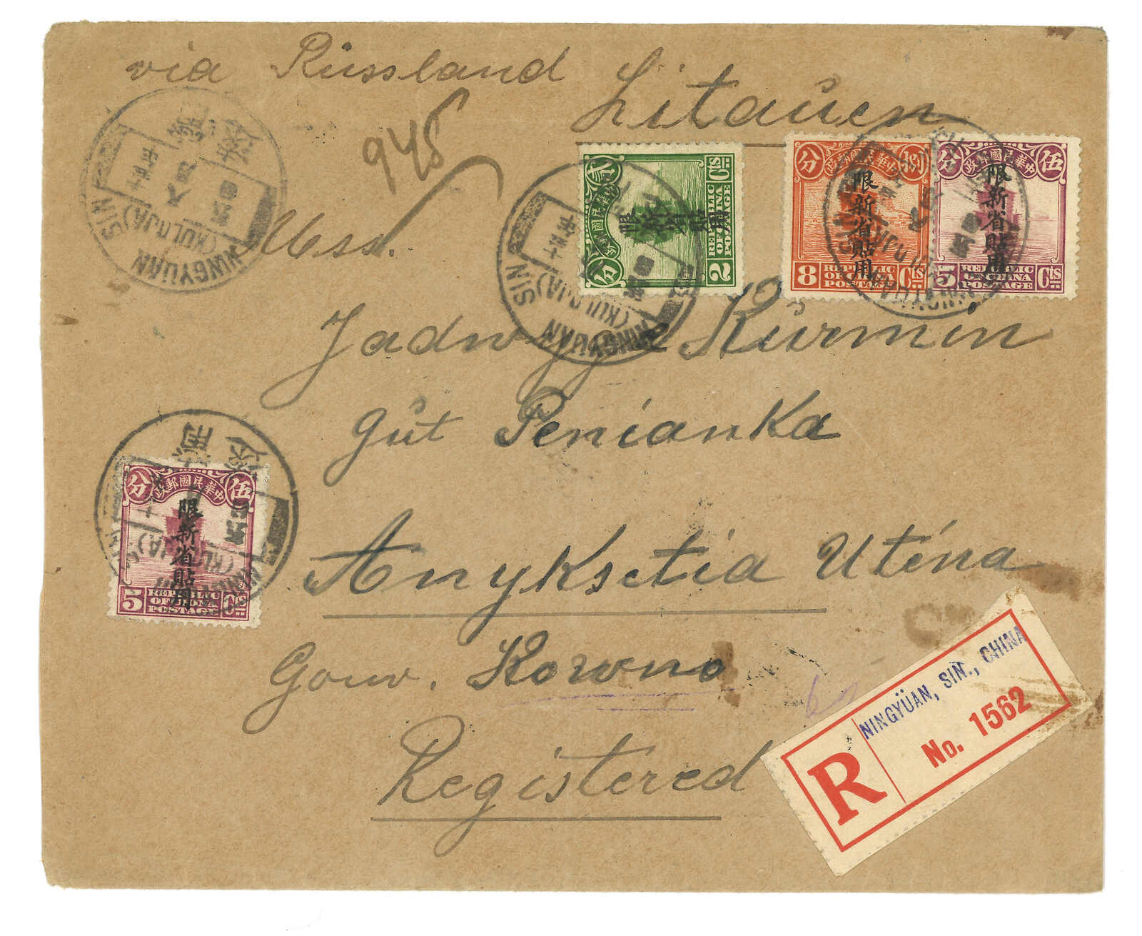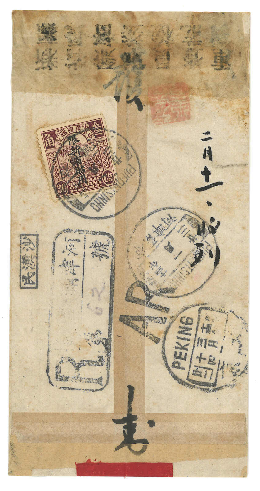 3190 cover image1924 Poerhtsinho (8 Jan) to Peking. Double-registered red band cover, f.w. Junk ovpt. Limited For Use in Sinkiang 2c in pair + 10c x3 on reverse, tied by Poerhtsinho bilingual cds, alongside with AR mark, registered mark and censor label. Arrived Peking (22 Feb).