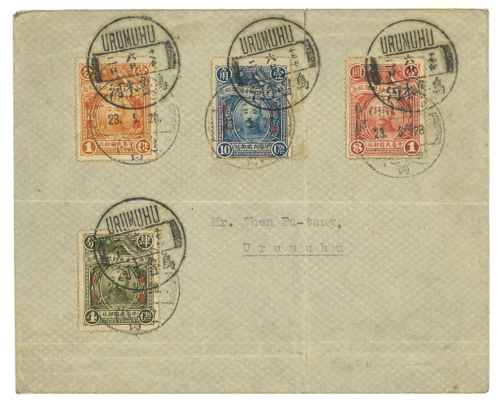 3180 cover image1928 (2 Jun) Urumuhu local, f.w. Marshall Chang ovpt. "Use in Sinkiang" complete set (Chan PS71-74), tied by Urumuhu and Tihwa bilingual cds. Nice franking, especially the $1 stamp. Cover with tear at middle but not affecting stamp.