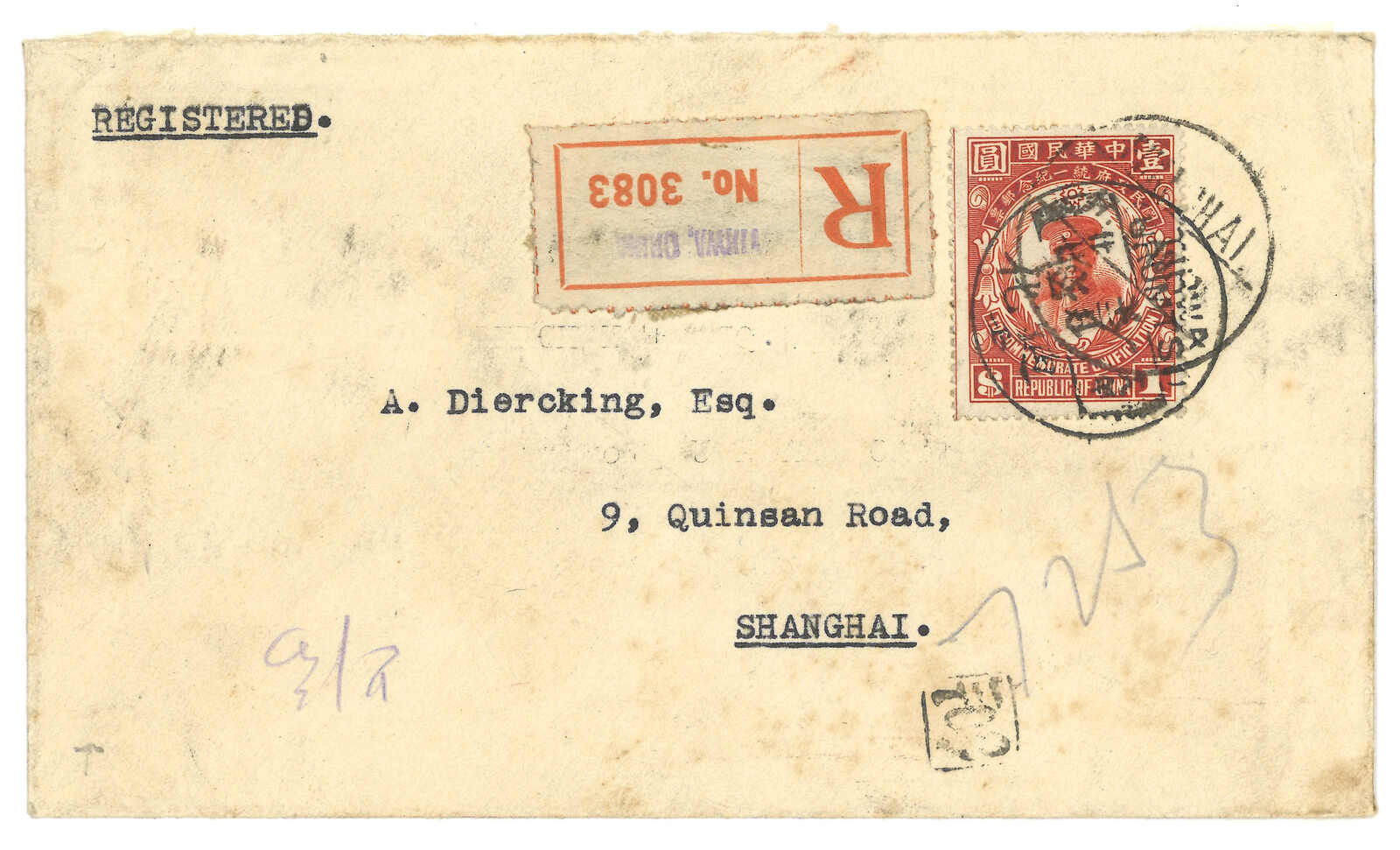 3183 cover image1920s TIhwa to A. Diercking, Shanghai. Registered cover, f.w. unovpt. Unification $1 (Chan 300), tied by TIhwa bilingual cds., along with registered label and censor label. Arrived Shanghai. Ovpt. "For Use in Sinkiang" issues should be used but exceptions on commemorative issues are seen. Nice franking of high denomination $1.
