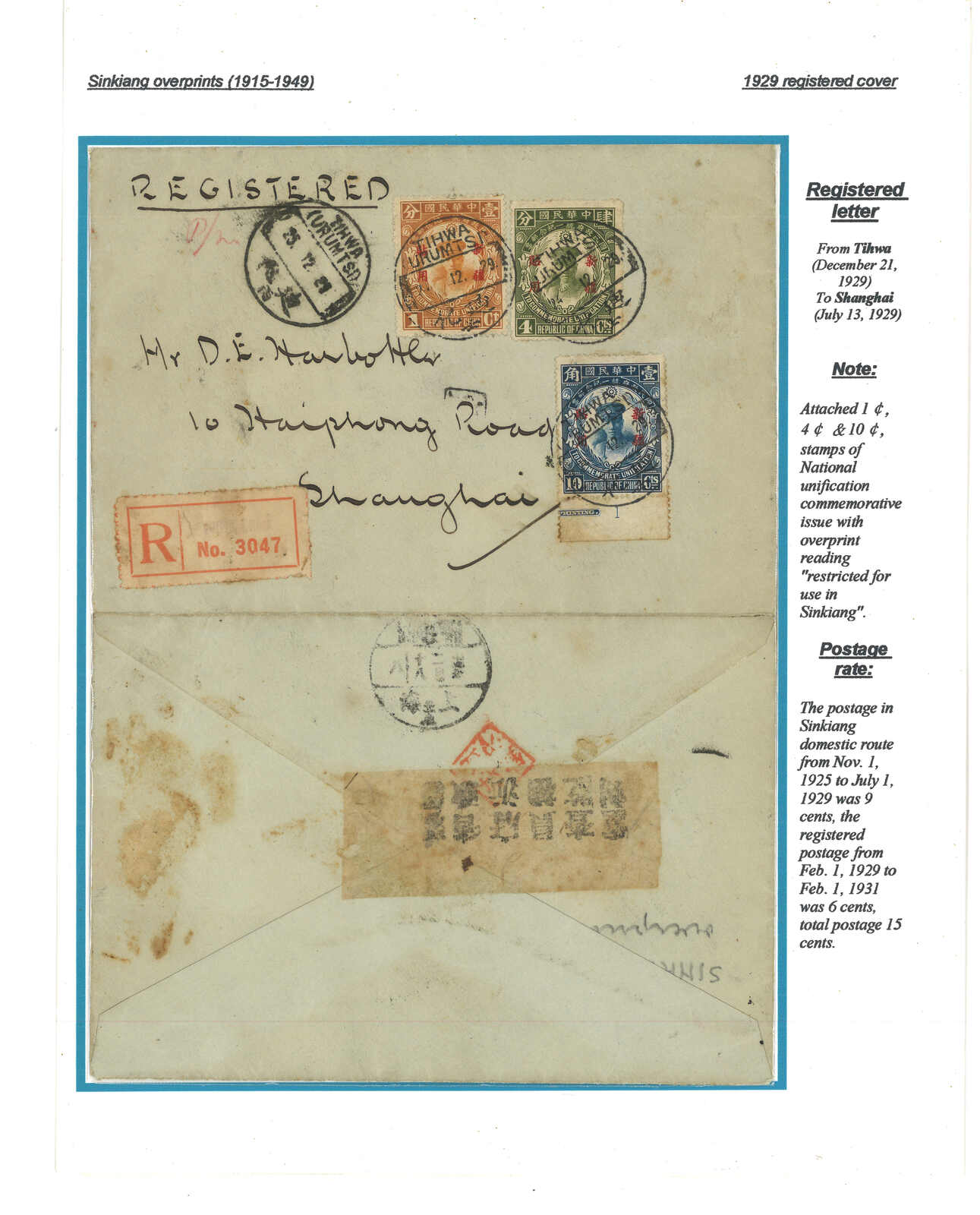 1929.12.21 迪化寄上海。掛號封,貼統一紀念票加蓋“新疆貼用”1分 + 4分 + 1角,銷迪化腰框漢英日戳。另見掛號標籤及檢查封條。2.18抵上海。封剖開以作展示。(Image 1)