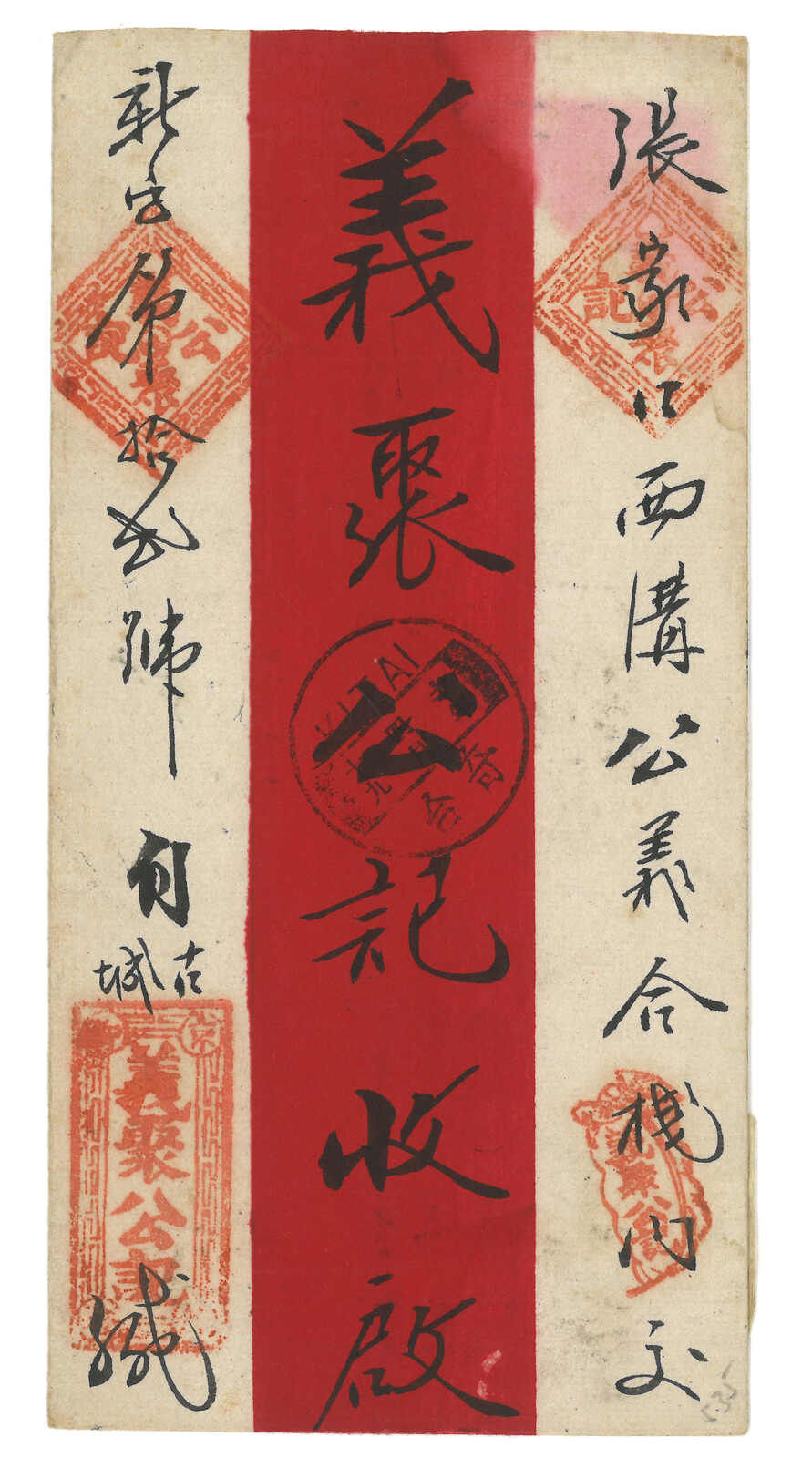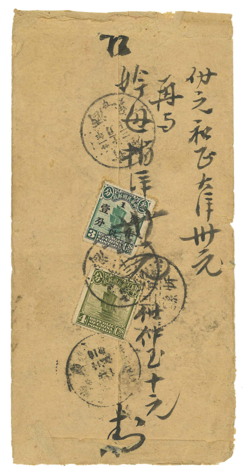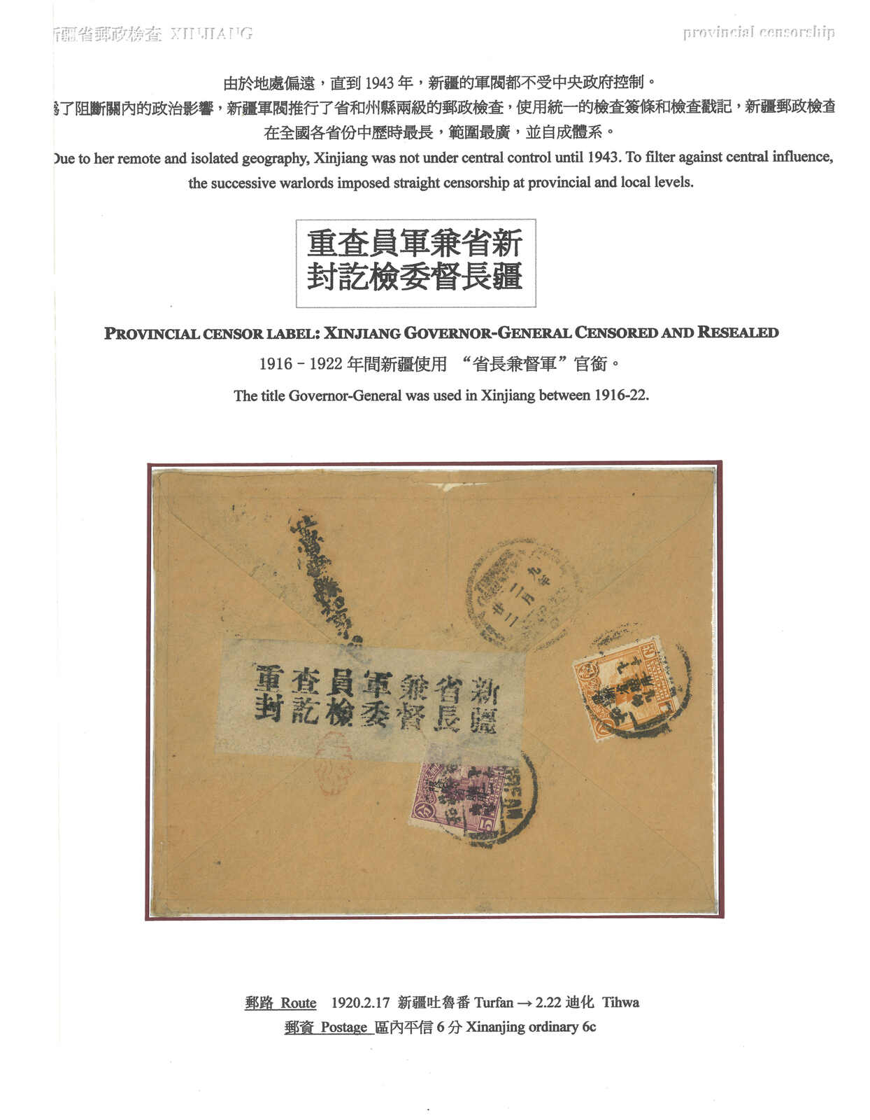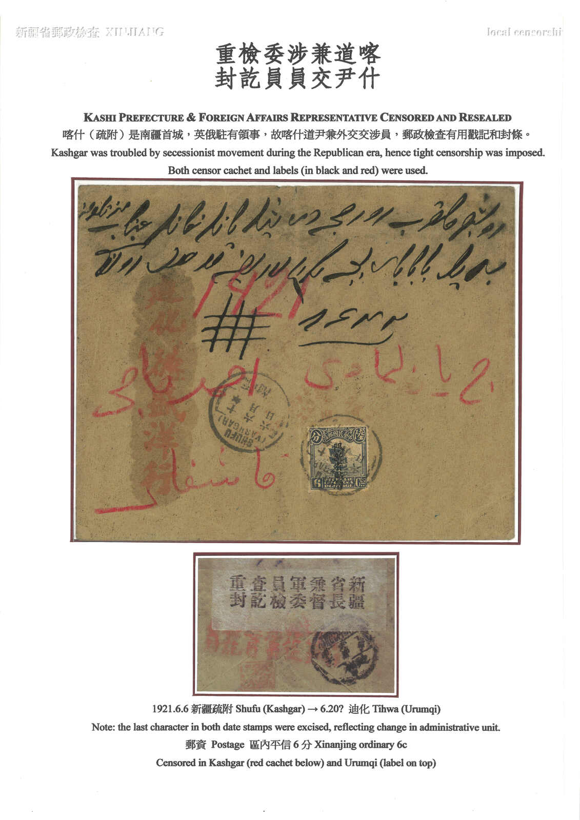 3198 cover image1921 Kitai (19 Apr) to Kalgan. Red band cover, f.w. Junk ovpt. Limited For Use in Sinkiang 3c + 6c on reverse, tied by Kitai bilingual cds. Alongside with Kitai type 2 censor label. Transit Lanchow (6 May), Peking (14 May). Illustration p. 168 in "The Postal History of Xinjiang (Sinkiang)" by Danny Wong and Xie Weijing.