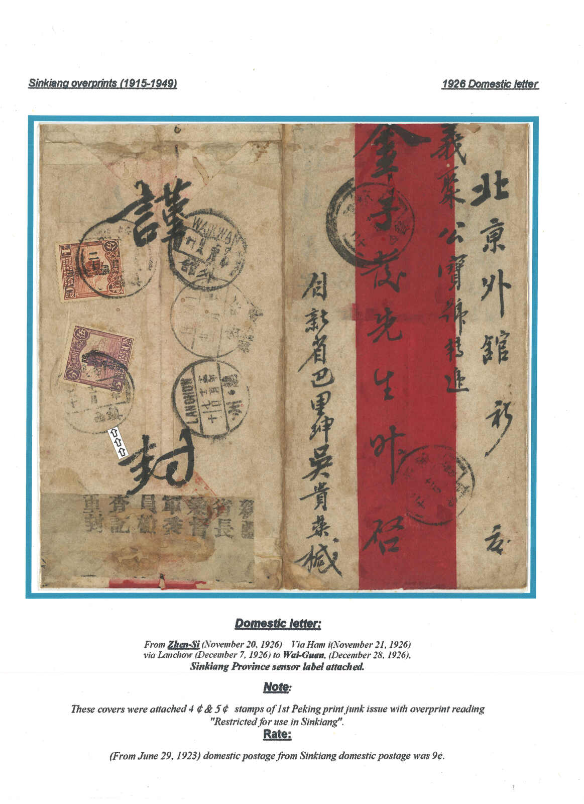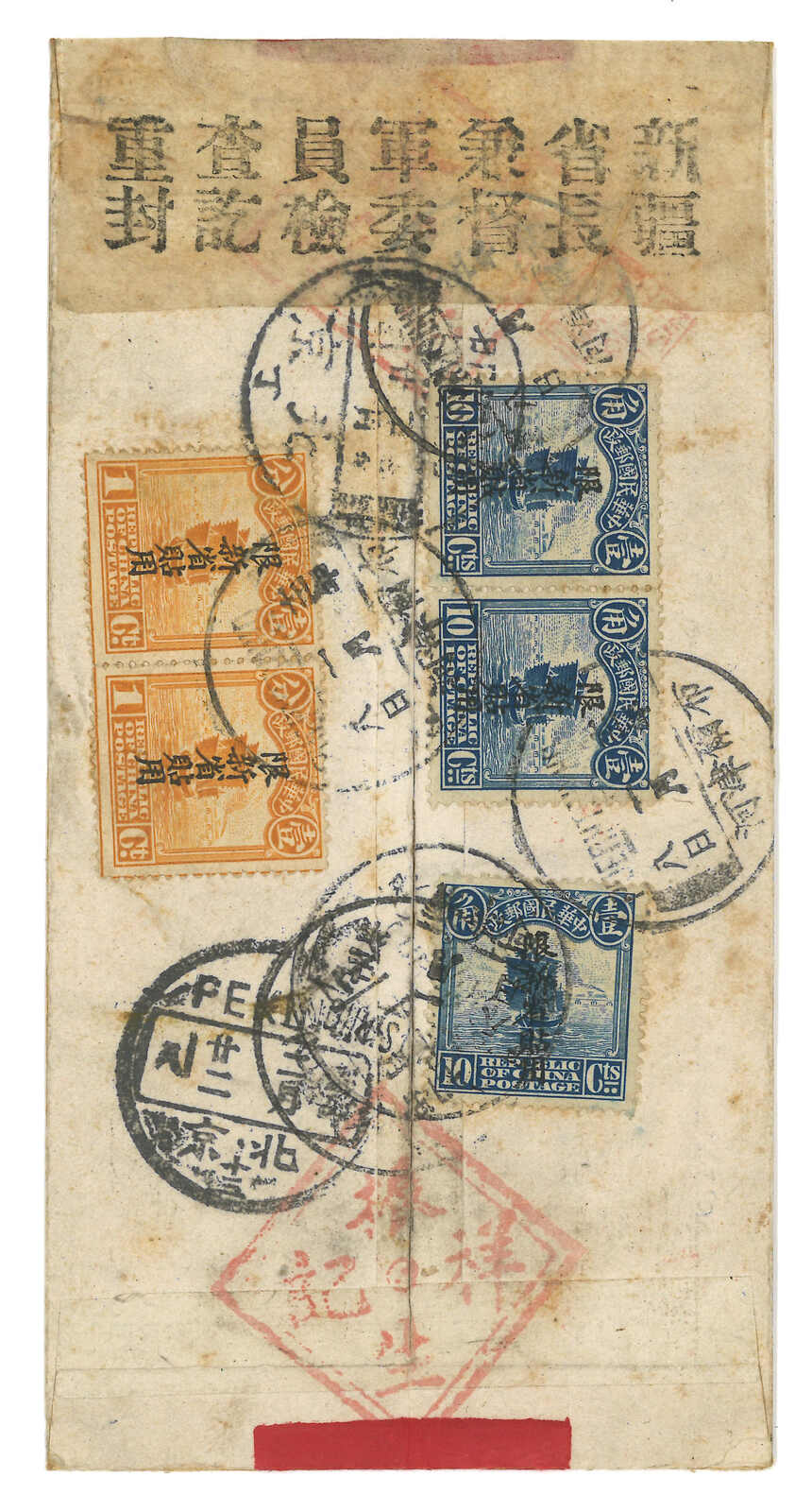 3192 cover image1926 Chensi (20 Nov) to Peking. Red band cover, f.w. Junk ovpt. Limited For Use in Sinkiang 4c + 6c on reverse, tied by Chensi bilingual cds. Censored and resealed. Transit Hami (21 Nov), Lanchow (8 Dec). Arrived Waikwan (28 Dec). Cover opened out for display.