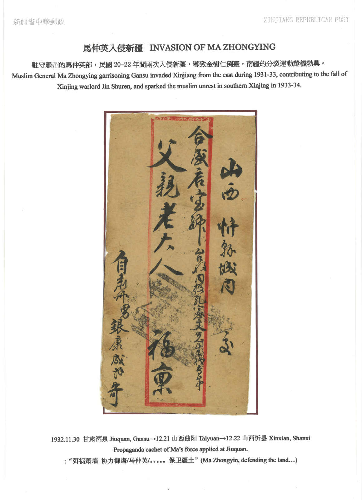 1932.11.30 酒泉寄忻縣,背貼帆船4分 + 改值1分蓋3分,銷山西酒泉三格日戳。12.21經曲陽。12.22抵忻縣。正面鈐馬仲英之宣傳口號戳。馬仲英於1933至1934年入侵新疆,導致金樹仁倒台。(Image 1) (Image 2) (Image 3)