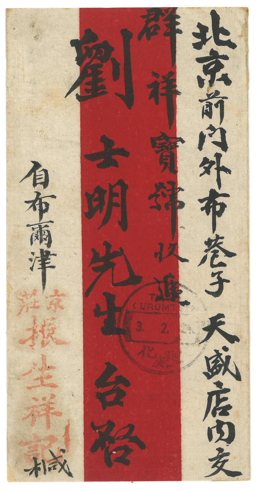 3188 cover image1921 Chenghwasze (Sharasume) (19 Mar) to Peking via Tihwa. Red band cover, f.w. Junk ovpt. Limited For Use in Sinkiang 4c + 5c on reverse, tied by Chenghwasze (Altai) bilingual cds, along with Ashan (Altai) censor mark. Arrived Waikwan (11 May). Cover opened out for display. In 1918, the Chinese courier route was expanded westward beyond Kobdo and a Chinese PO was esstablished in Chenghwasze. Hellrigl recorded only one cover from this PO dated 14 Sep 1919 (2025 Jul AVA, lot 864). In 1919, Chenghwasze was annexed to the Altai region of Sinkiang.