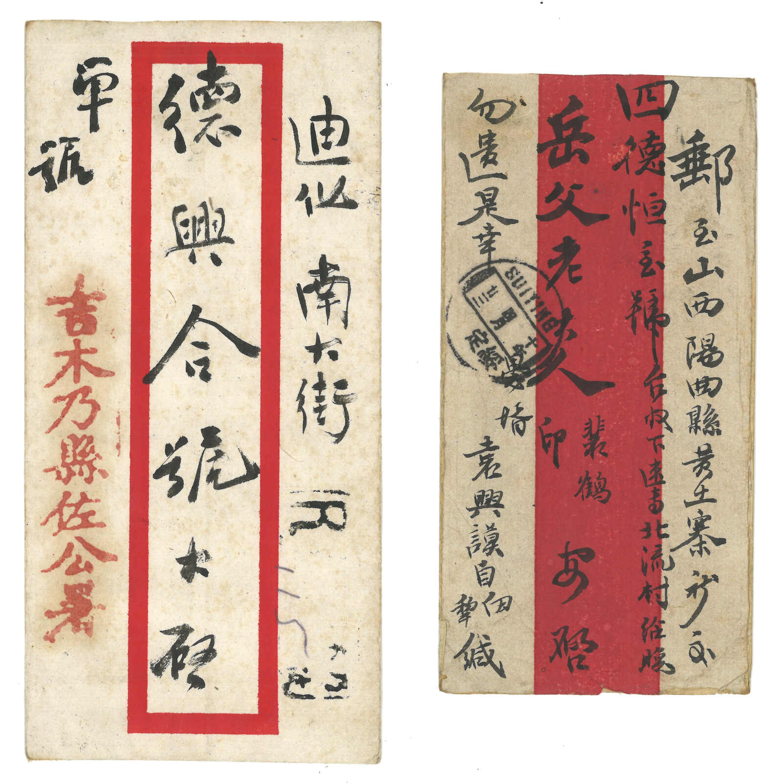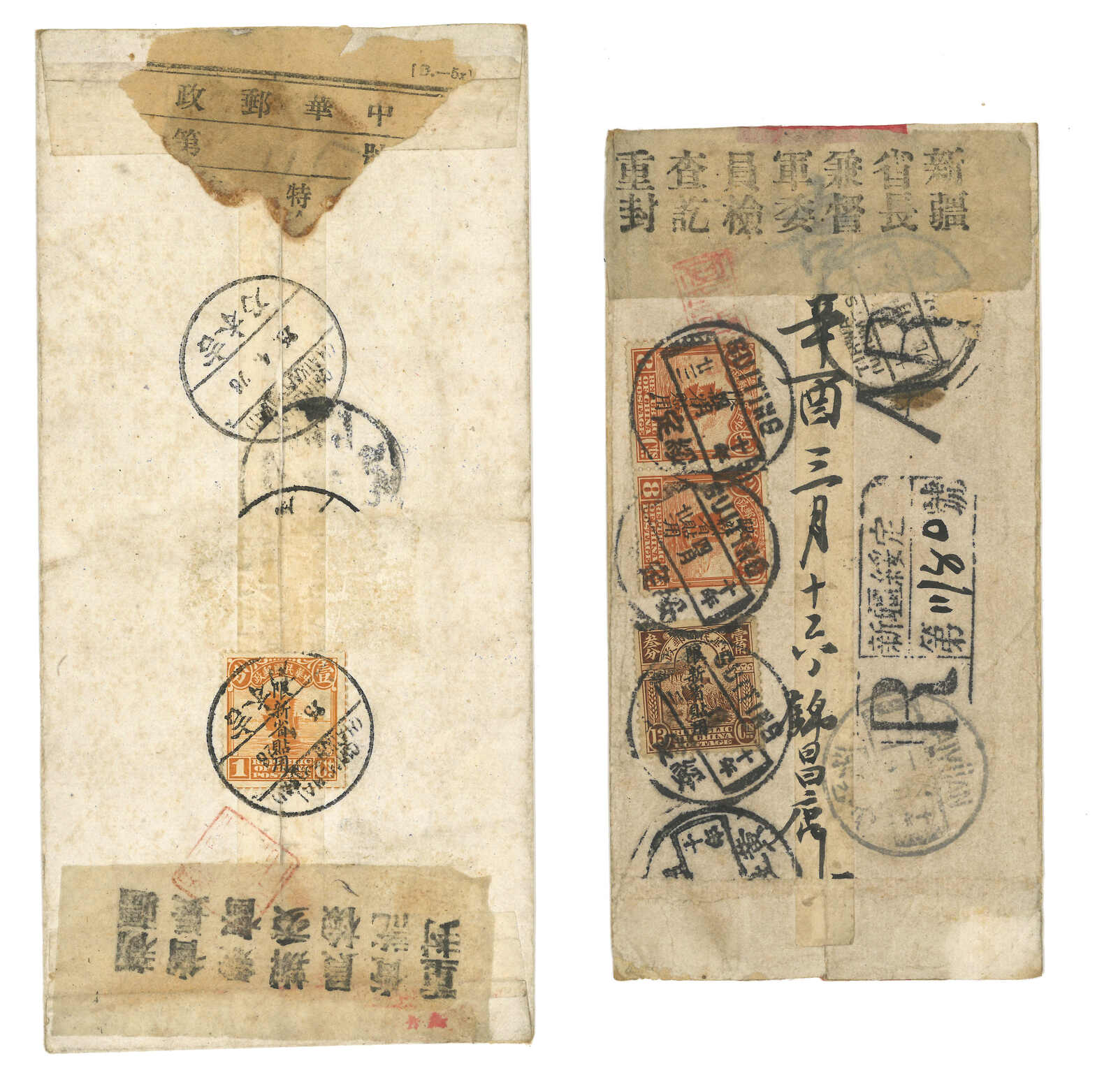 1929年一對迪化寄上海掛號封,分別貼未加蓋之統一紀念及國葬票,銷迪化腰框英漢日戳。均見掛號標籤及檢查封條。當時應貼用加蓋限新票,但在紀念票上時見例外。(Image 1) (Image 2)