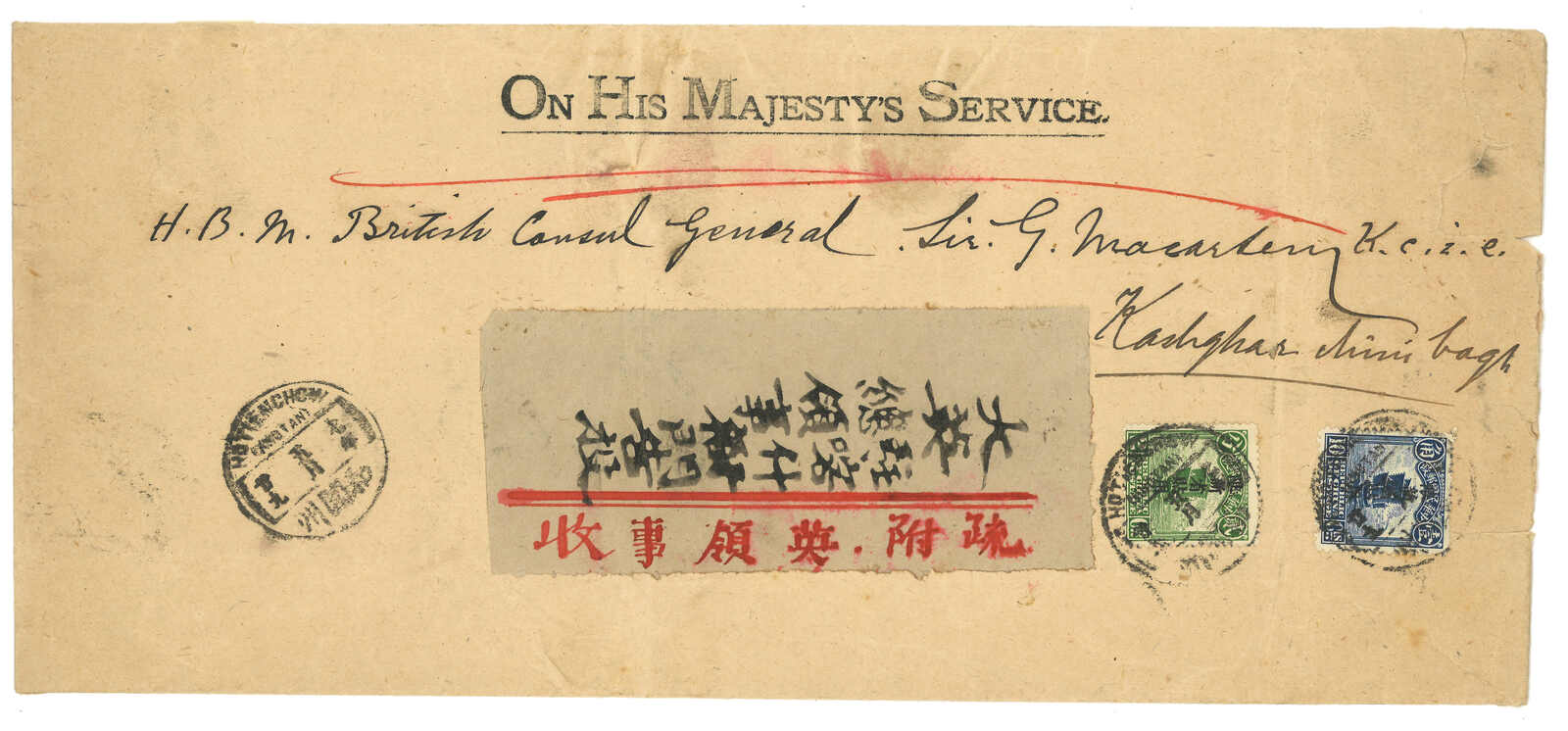 3194 cover image1928 Hotien (29 May) to British Consul Kasghar. OHMS cover, f.w. Junk ovpt. Limited For Use in Sinkiang 2c + 10c, tied by Hotienchow biliingual cds.
