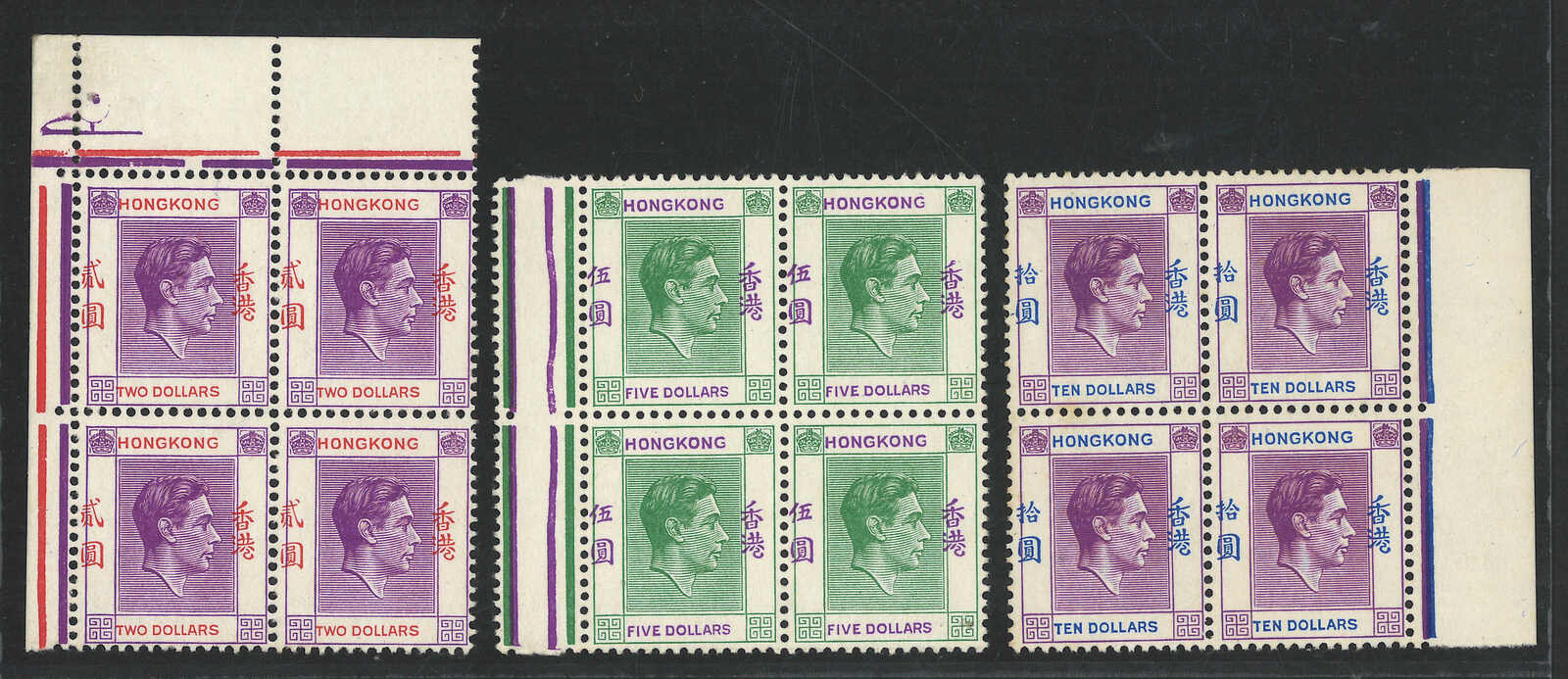 1946年香港佐治六世第三組2元、5元及10元四方連新(楊目166-168),均帶銘文移位變異。(Image 1) (Image 2)