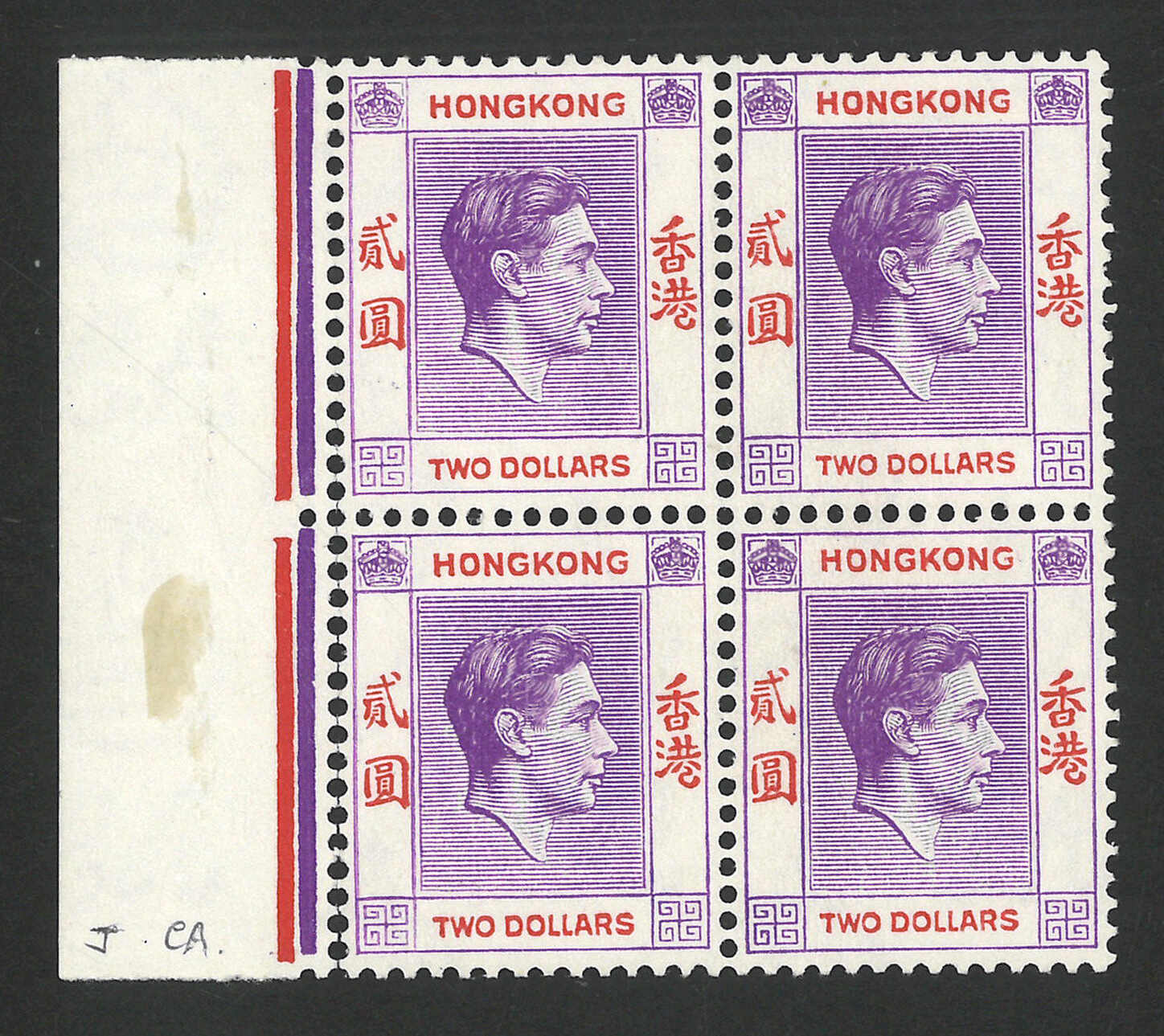 1946年香港佐治六世第三組2元單枚及四方連共3件(楊目166),展示了銘文移位及複印變異。均為新。(Image 1) (Image 2) (Image 3) (Image 4)