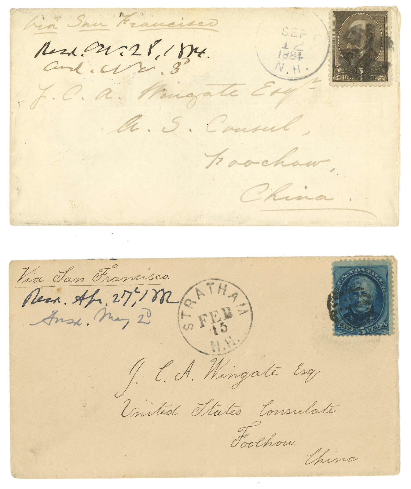 1882及1884年一對美國寄美國駐福州領事J.C.A. Wingate封,均貼美國票5分,銷殺手戳,另見Stratham日戳。前者經美國駐上海領事館中轉,後者則經香港至福州英局。雖然為年份相近、郵資相同之Wingate書信,但反映了不同郵路,十分有趣。而當時上海美國客郵局早已使用“US Postal Agency”銘文之郵戳,故前者鈐領事館中轉戳亦較少見獨特。(Image 1) (Image 2)
