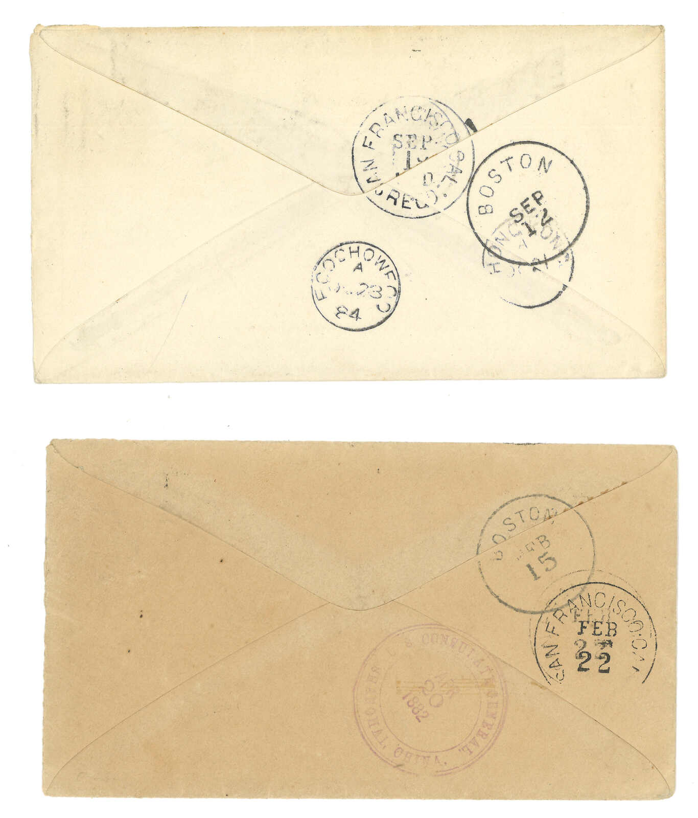 2359 cover image1882 and 1884 a pair of covers from USA to J.C.A. Wingate, US Consulate Foochow, both f.w. US 5c, tied by by obliterator along with cds. Former transit via US Consulate Shanghai while latter via Hong Kong to Foochow BPO. A very interesting pair given the different route of the same correspondence and rate. Also, former applied with US Consulate Shanghai transit cds is also unusual as postmarks with inscriptions "US Postal Agency" was already in use by that time.