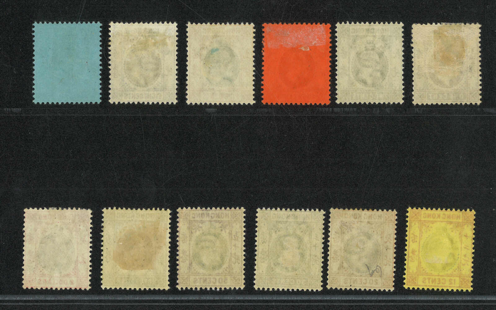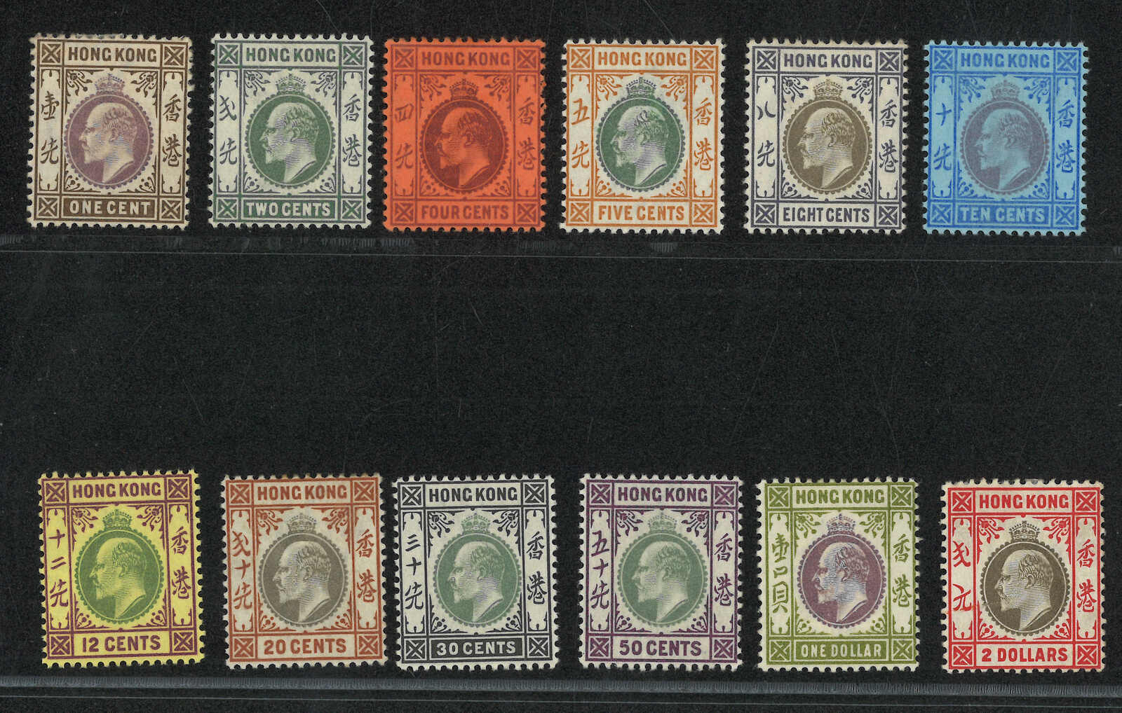 1903年香港愛德華七世第一組正CA水印新票12枚,由1仙至2元(楊目61-72),背貼。(Image 1) (Image 2)