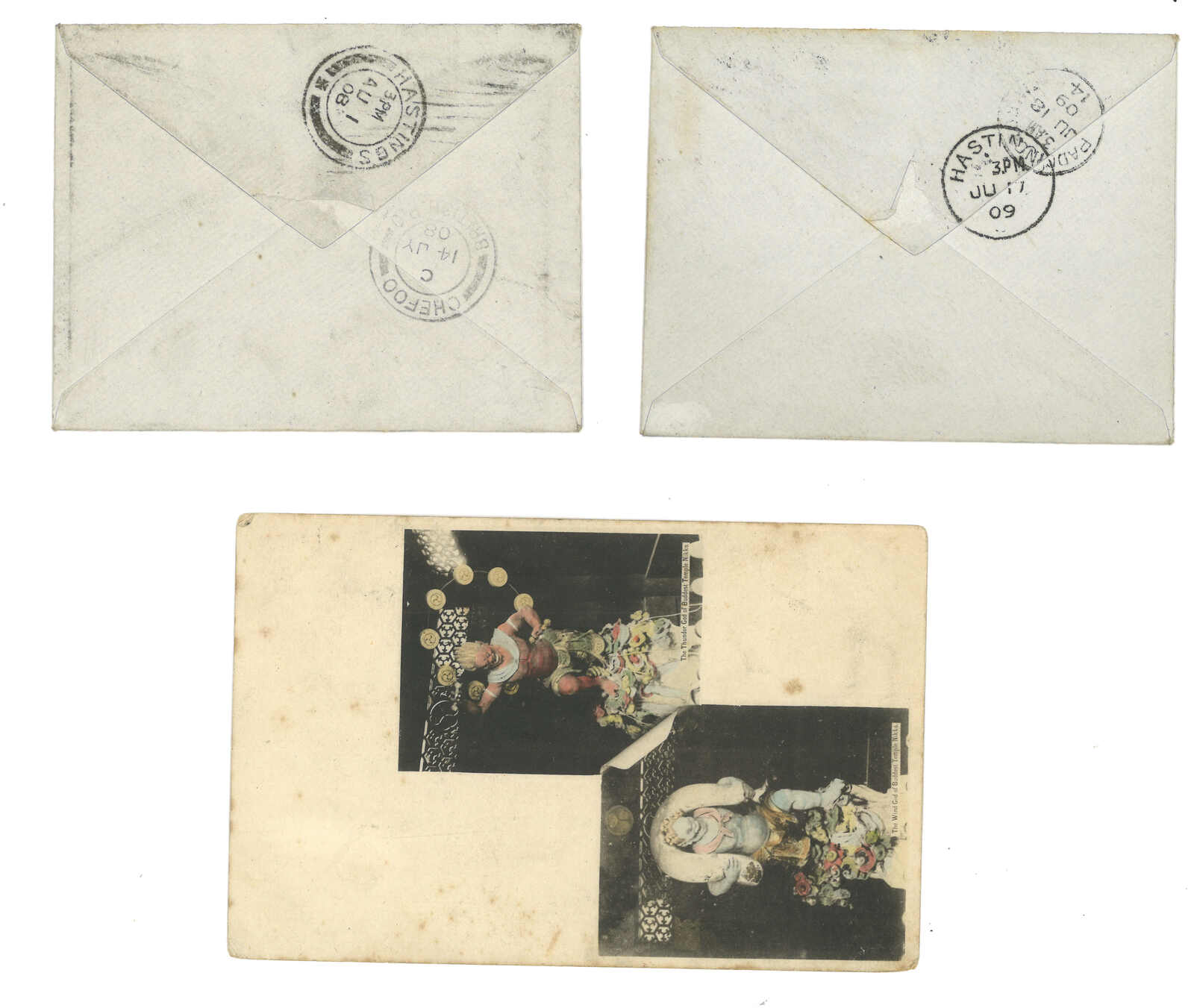 1904至1909年一組三件劉公島寄英國封片,均貼香港愛德華七世票合4仙,銷劉公島英局Webb B型或C型日戳。明信片另見上海英局中轉戳,一件信封則見煙台英局中轉戳。(Image 1) (Image 2)