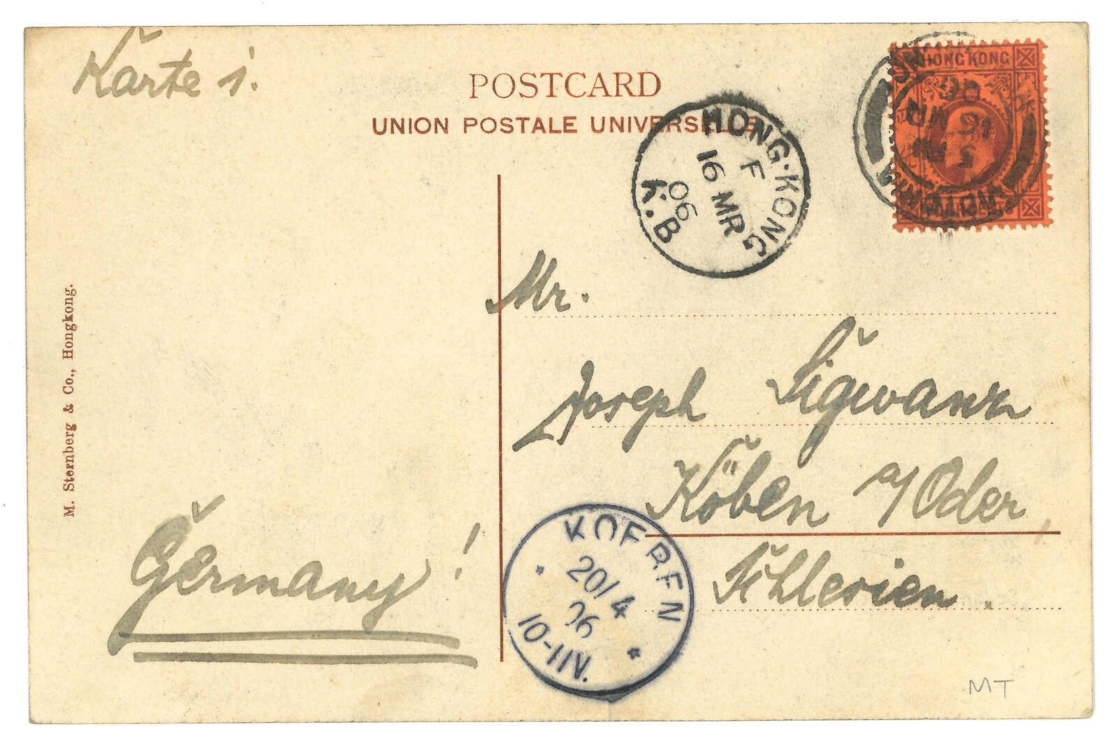 1614 cover image1906 Kowloon (16 Mar) to Germany. Picture postcard, applied with Kowloon Branch Webb type B cds. F.w. KEVII 4c, tied by Victoria (16 Mar) cds. Arrived Germany (20 Apr).
