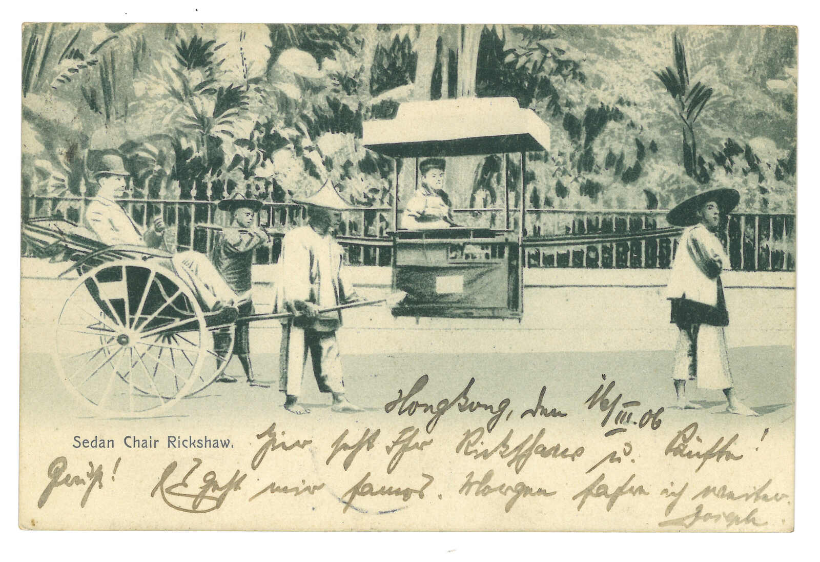 1906.3.16 九龍寄德國。圖片明信片,鈐九龍分局Webb B型日戳。貼愛德華七世4仙,銷維多利亞3.16日戳。4.20抵德國。(Image 1) (Image 2)