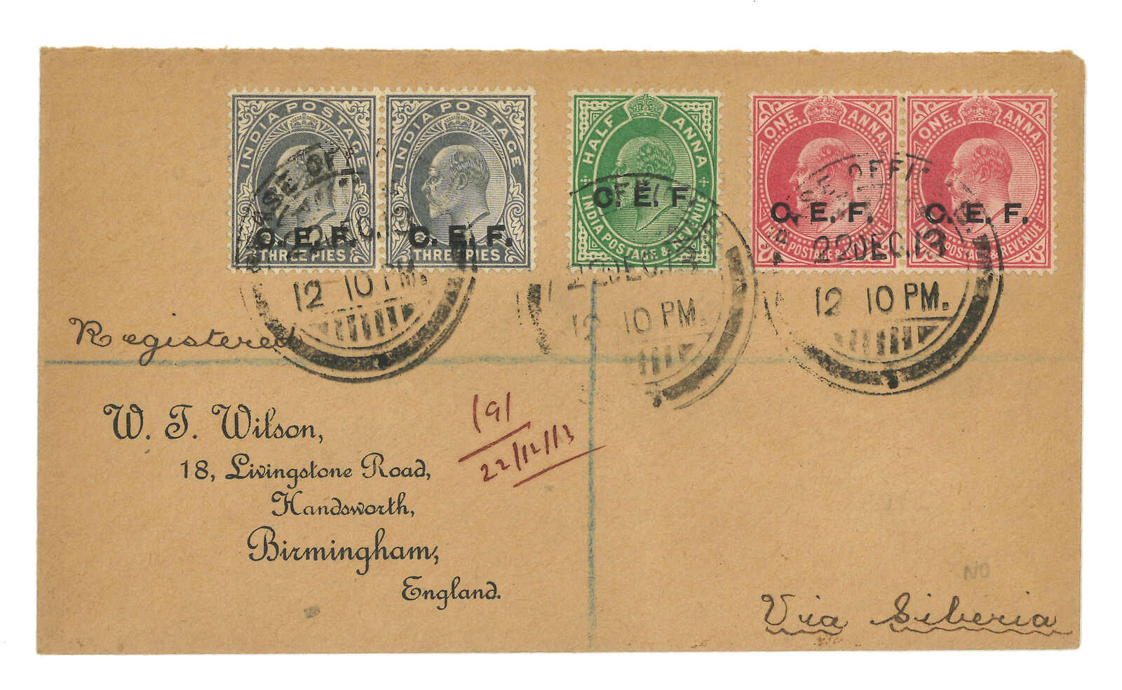 1913.12.22 天津寄英國,貼印度愛德華七世加蓋CEF 3派雙連 + 半安娜 + 1安娜雙連,銷基地B局18型日戳。背貼天津基地郵局掛號標籤。1.6經倫敦。1.6抵伯明翰。(Image 1) (Image 2)