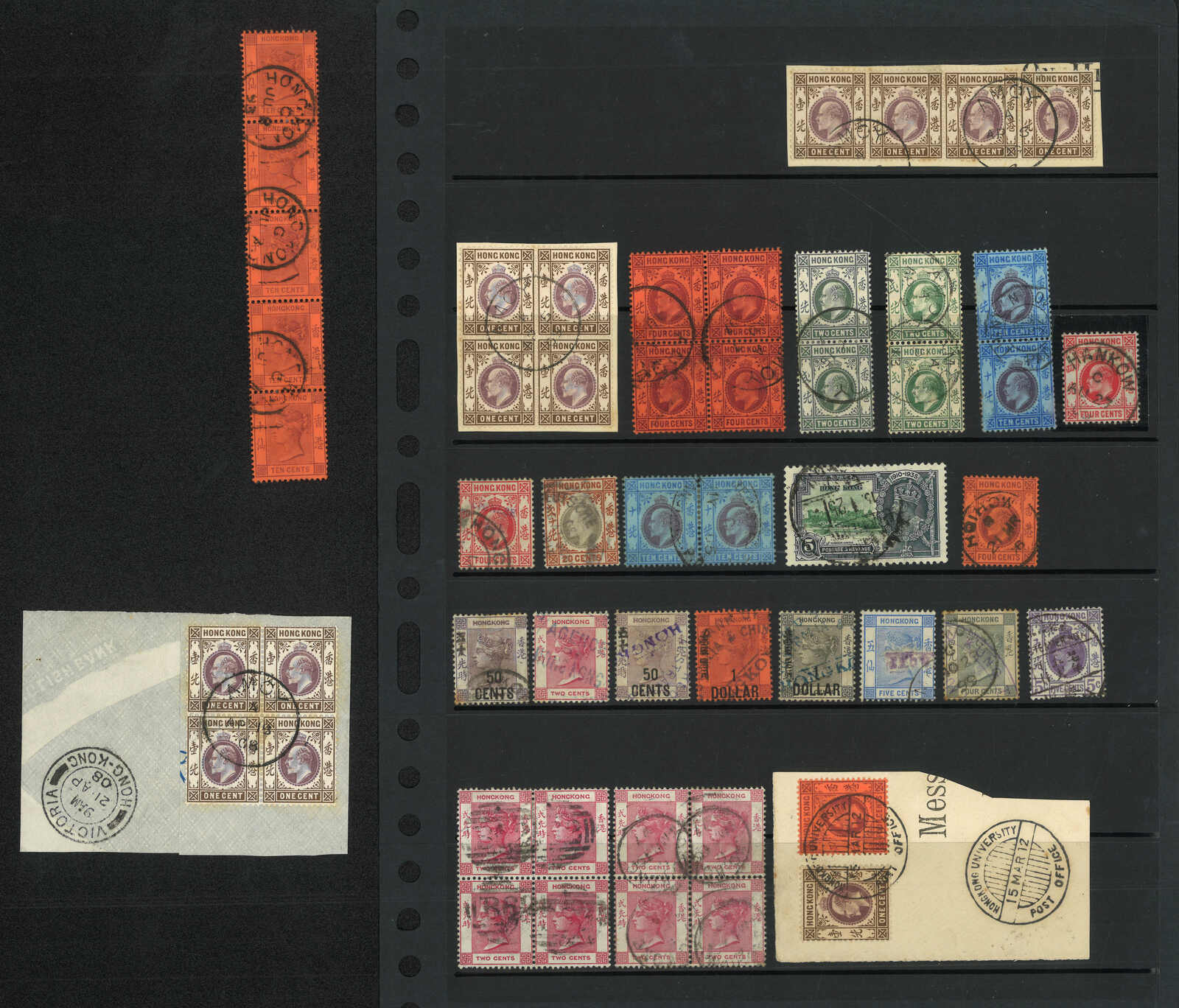 一組25枚香港維多利亞女皇像及愛德華七世舊票、方連及剪片,展示了不同之香港及商埠戳式,包括香港大學、廈門、漢口、海口等。請預覽。(Image 1)