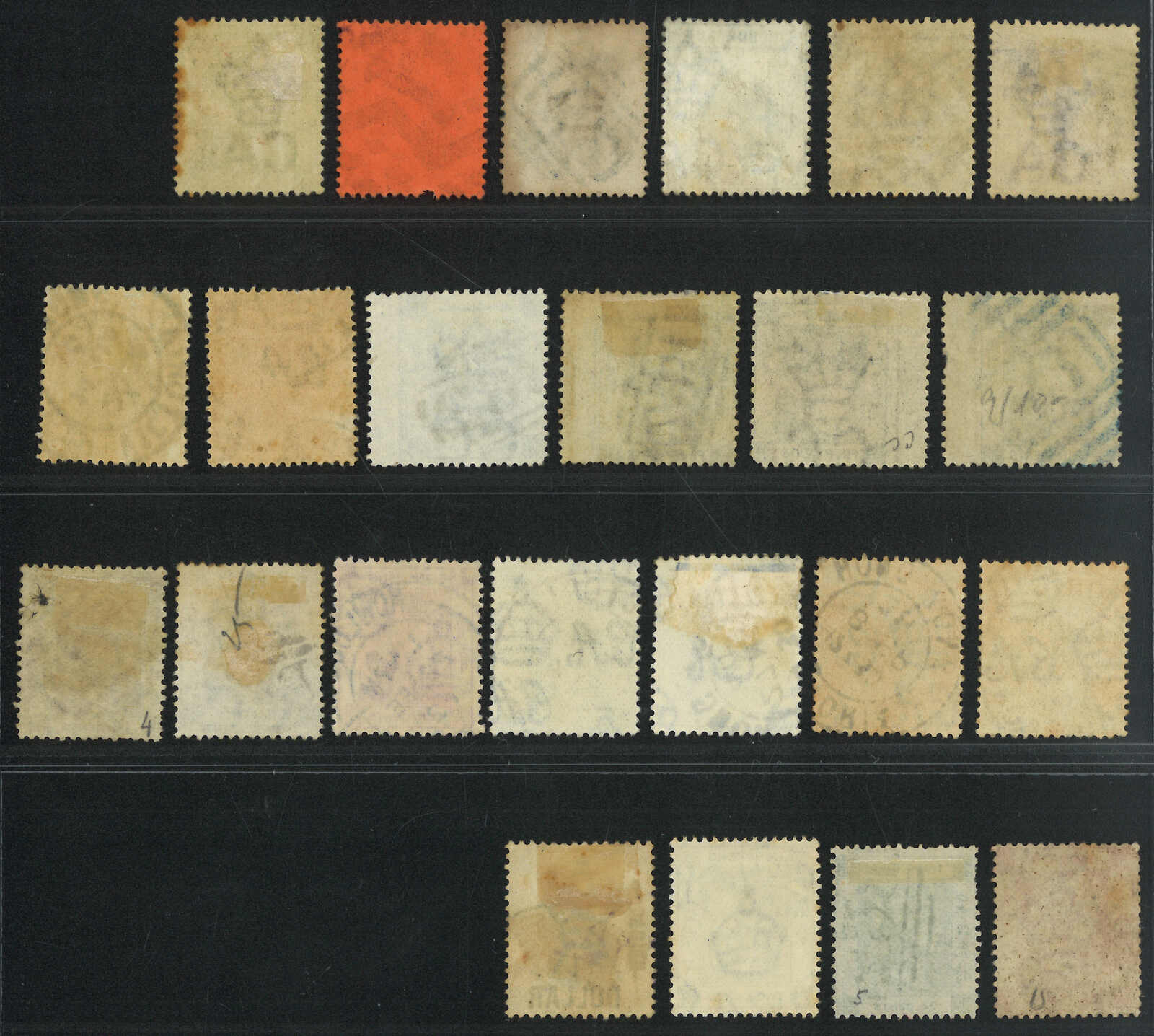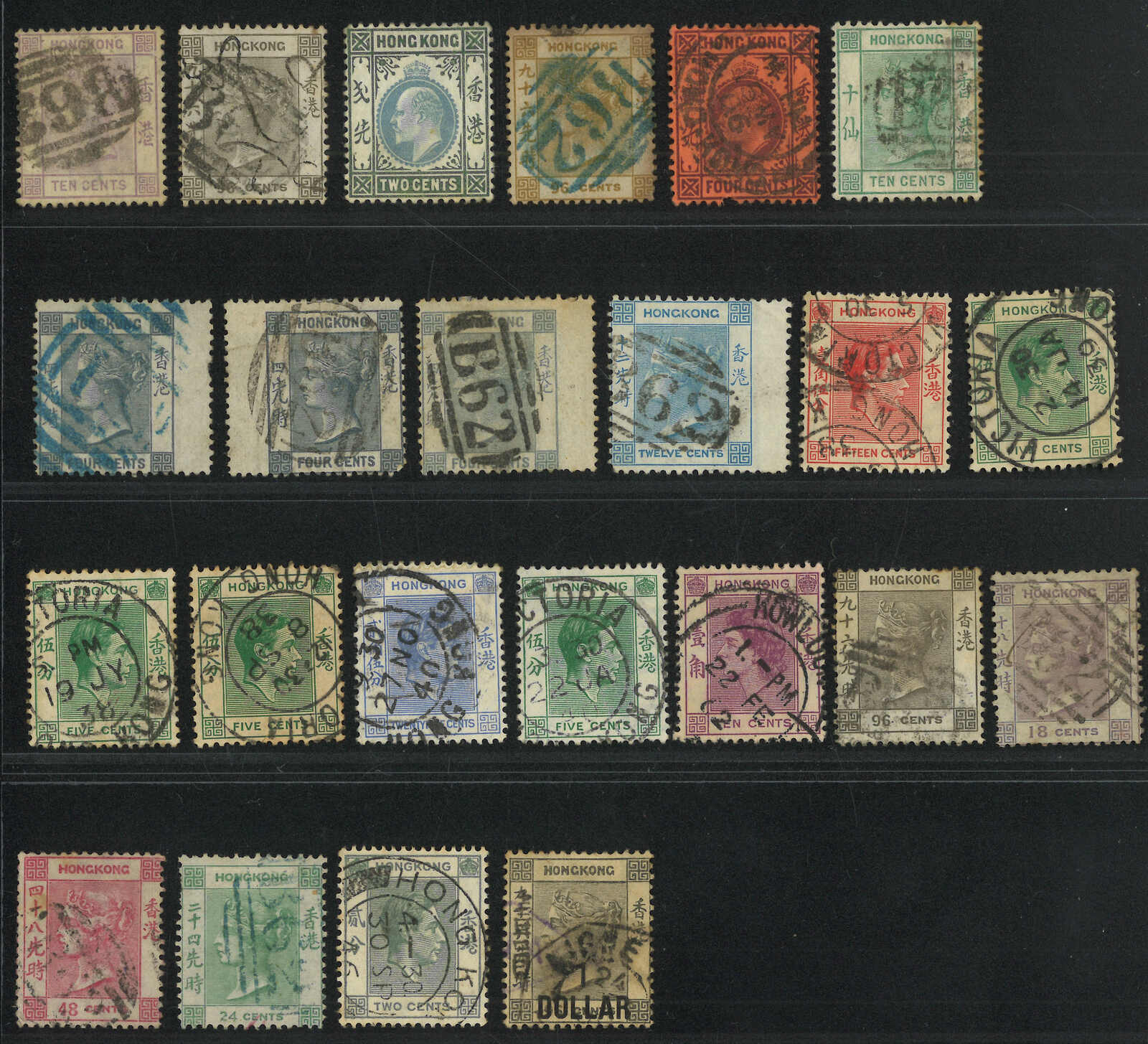 一組23枚香港維多利亞女皇像、愛德華七世、佐治六世及伊利沙白二世舊票,部分帶寬邊,銷殺手戳或圓形日戳。(Image 1) (Image 2)
