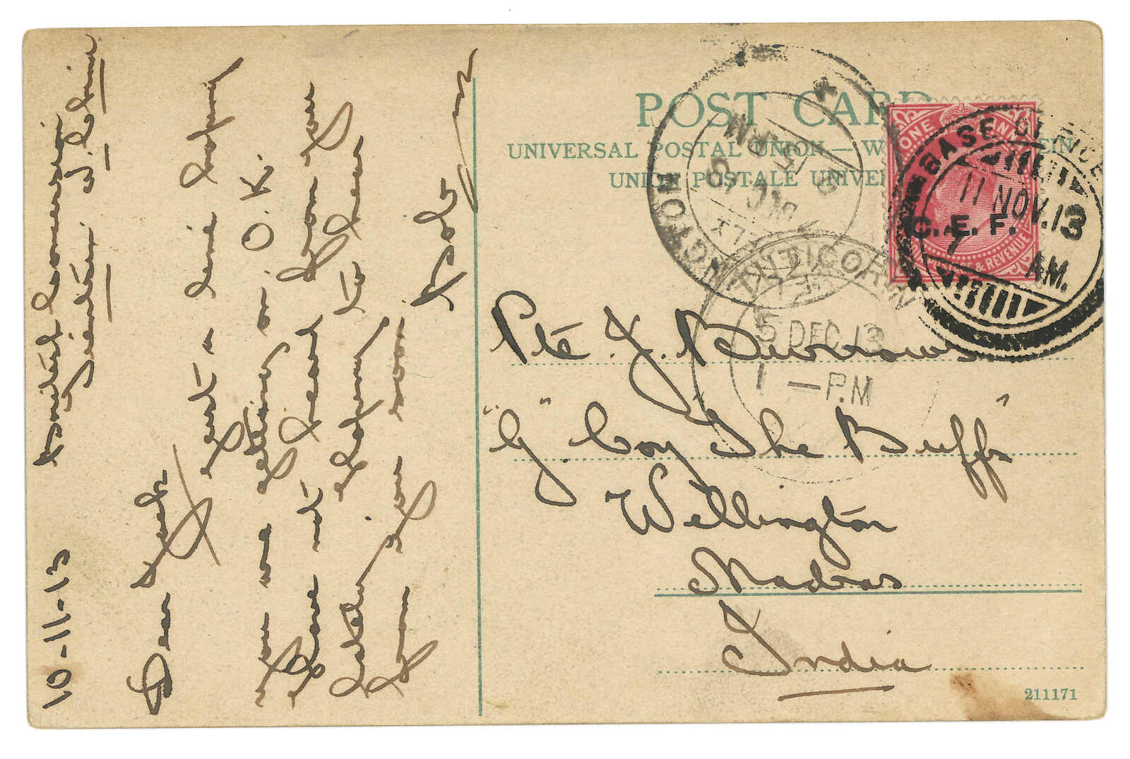 1913.11.11 天津寄印度。圖片明信片,貼印度維多利亞女皇像加蓋C.E.F. 1安娜,銷基地郵局B 18型日戳。12.5經Tuticorin。12.7抵Wellington。基地郵局B當時位於天津。(Image 1) (Image 2)