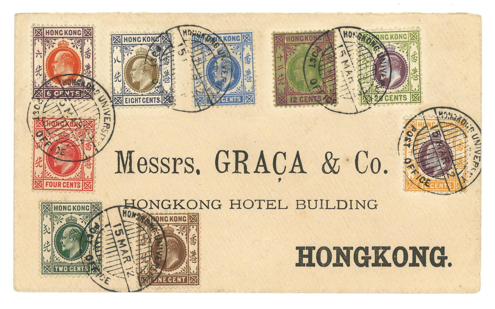 1912.3.15 香港大學紀念封,貼香港愛德華七世9枚,自1仙至30仙。1912年香港大學開幕,當時設立了臨時郵局,其紀念日戳僅於3月11日至16日使用。(Image 1) (Image 2)
