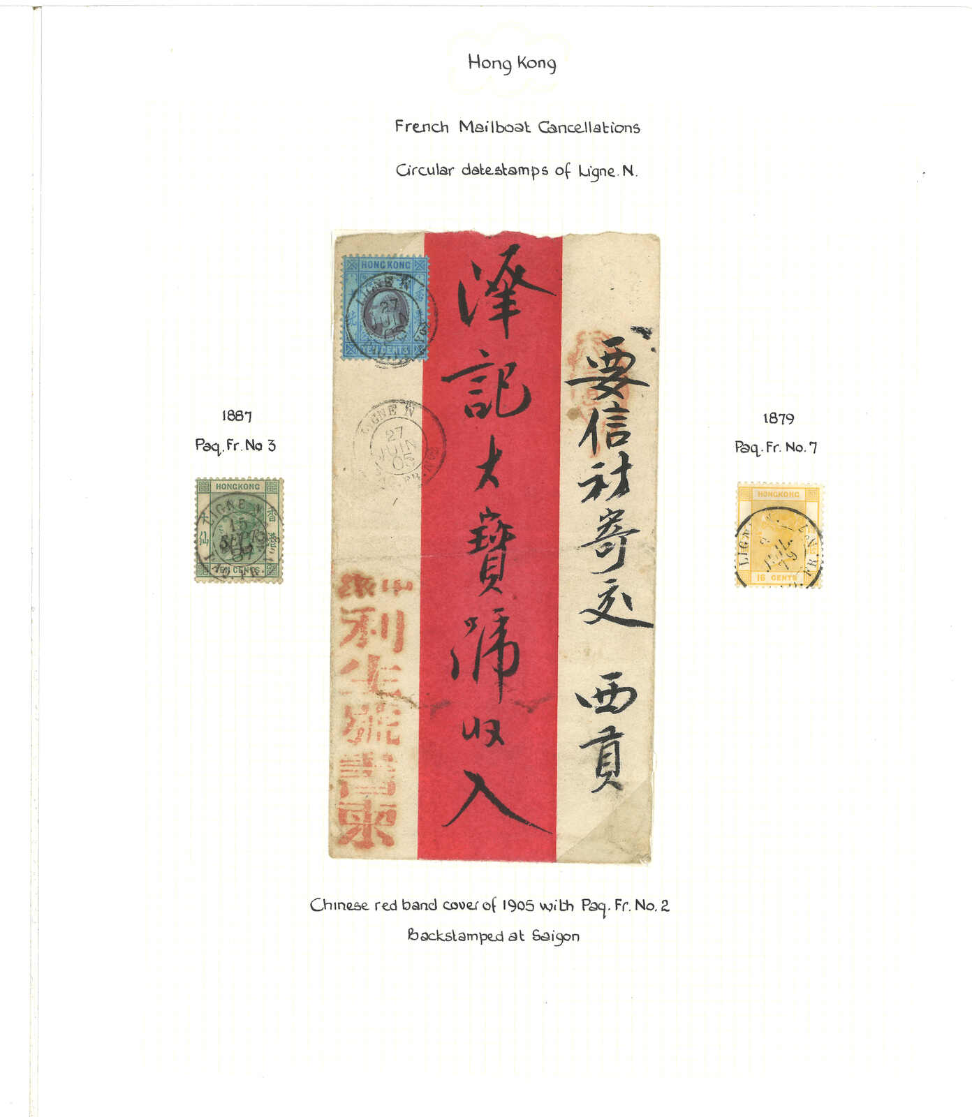 1857 cover image1905 (27 June) a red band cover sent from Hong Kong to Saigon, franked with a HK King Edward 10c stamp in blue purple cancelled by French double circled “LIGNE N PAQ. FR. No.2” and one more same cancellation adjacent. On the reverse, Cochin-Saigon arrival c.d.s. In addition, there are two single cancellation stamps with one HK QV 10c green cancelled by “LIGNE N PAQ. FR. No.3 / 15 sept 87”, and another HK QV 16c cancelled by “LIGNE N PAQ. FR. No.7”.