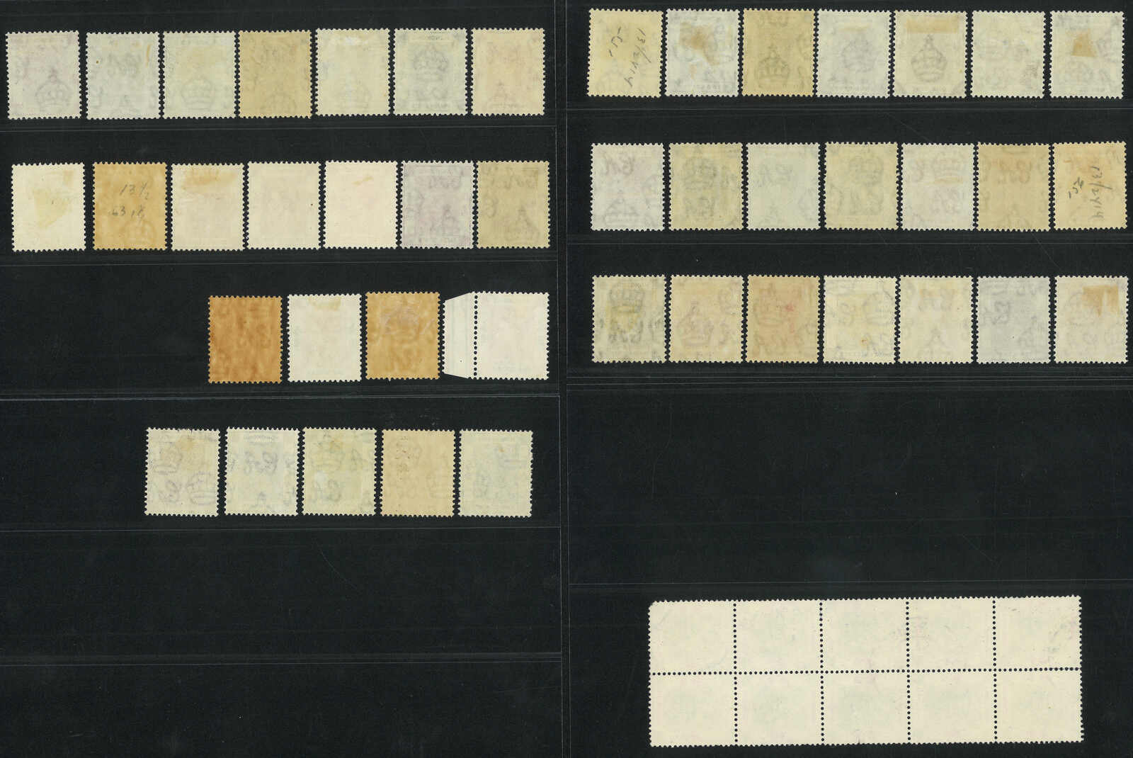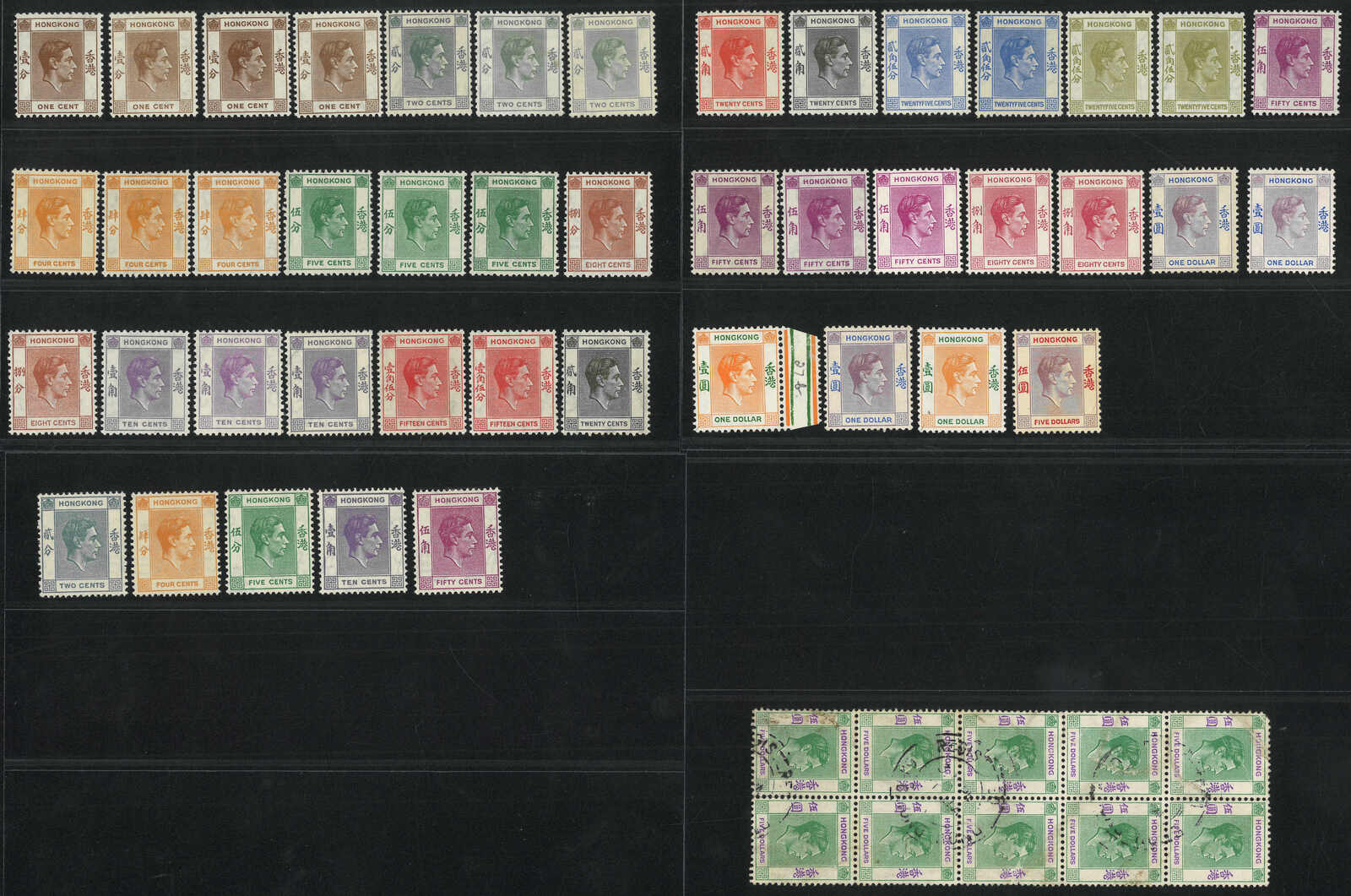 1634 * image1938-1946 a group of 44 Hong Kong KGVI mint stamps from 1c to $5, plus a $5 used block of 10.