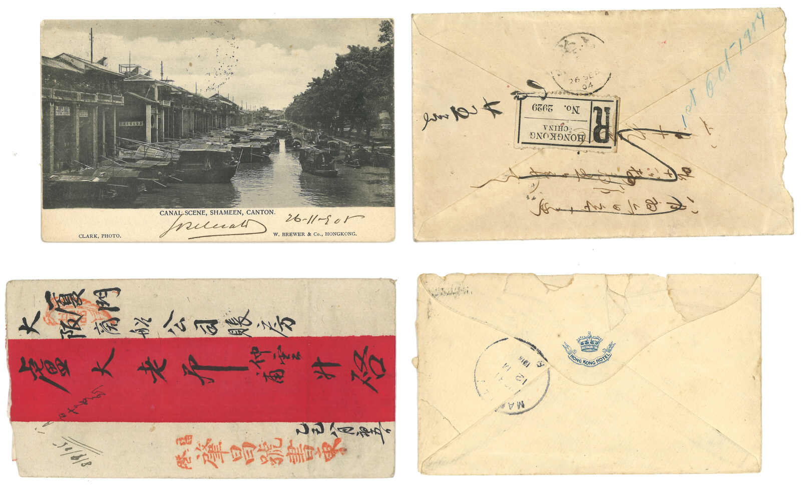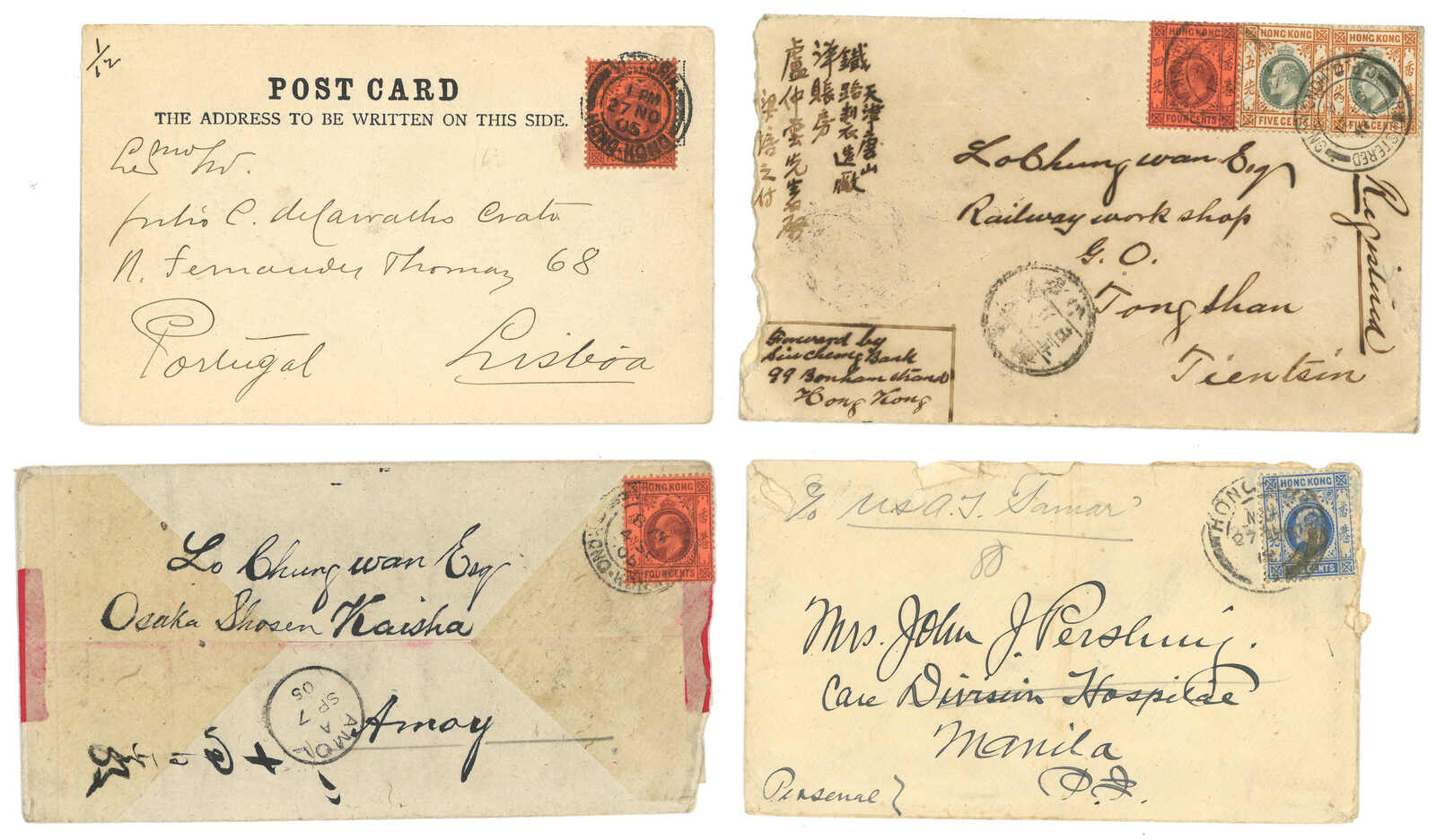 1900至1910年代一組四件貼香港愛德華七世普票之封片,鈐各款香港日戳。當中一件寄廈門英局,而另一件寄唐山鐵路製造廠。(Image 1) (Image 2)