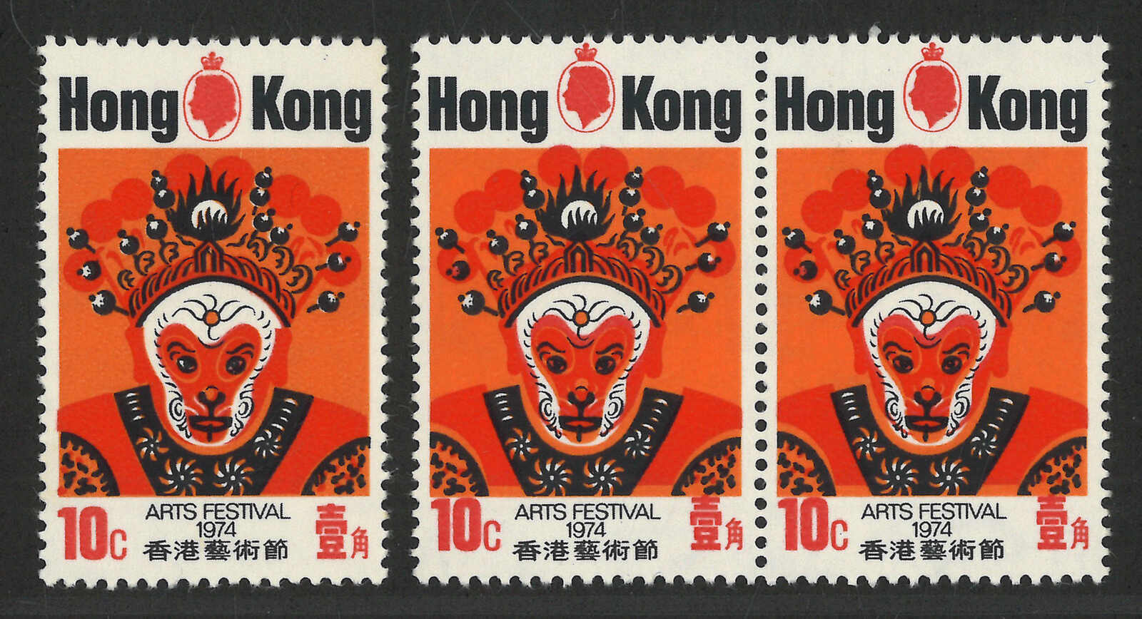 1682 **/bof image1974 Hong Kong Arts Festival 10c in horizontal pair, with red colour shifted upward variety (Yang C90), plus a normal single for reference.