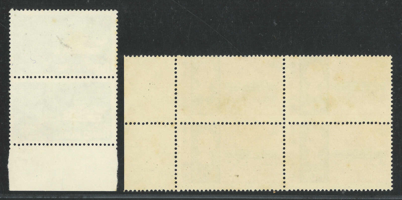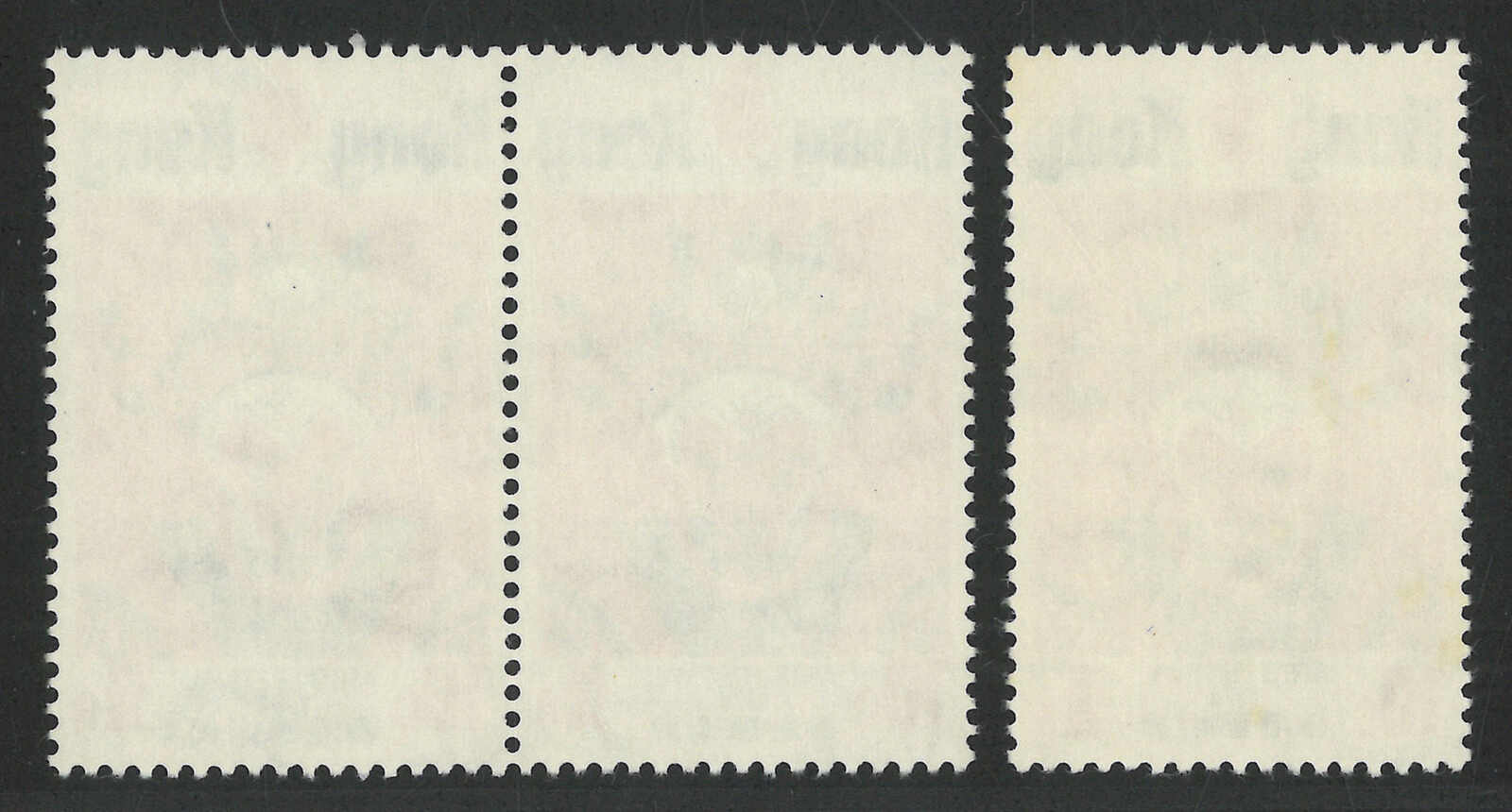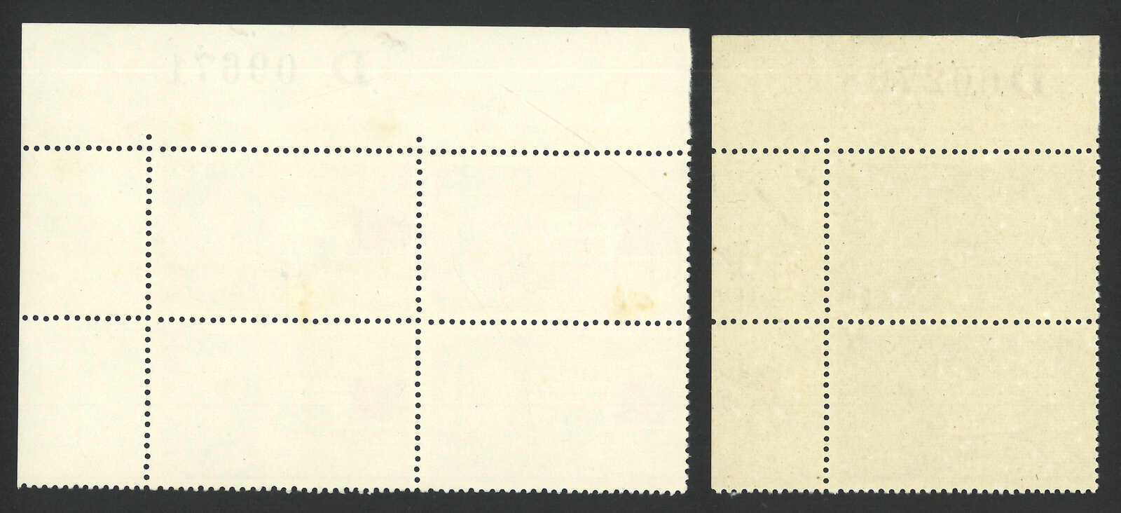 1974年香港藝術節紀念橫雙連新,帶紅色套印上移變異(楊目C90),另附一枚正常票作對比。(Image 1) (Image 2)