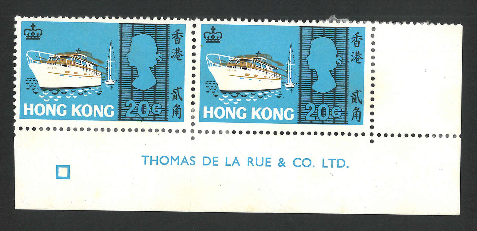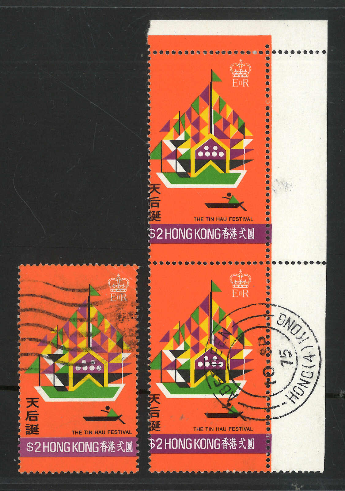 1975年香港節日紀念2元直雙連,帶齒孔移位變異(楊目C104),銷香港仔日戳。另附一枚正常舊票作對比。“戳王”劉國華舊藏。(Image 1)
