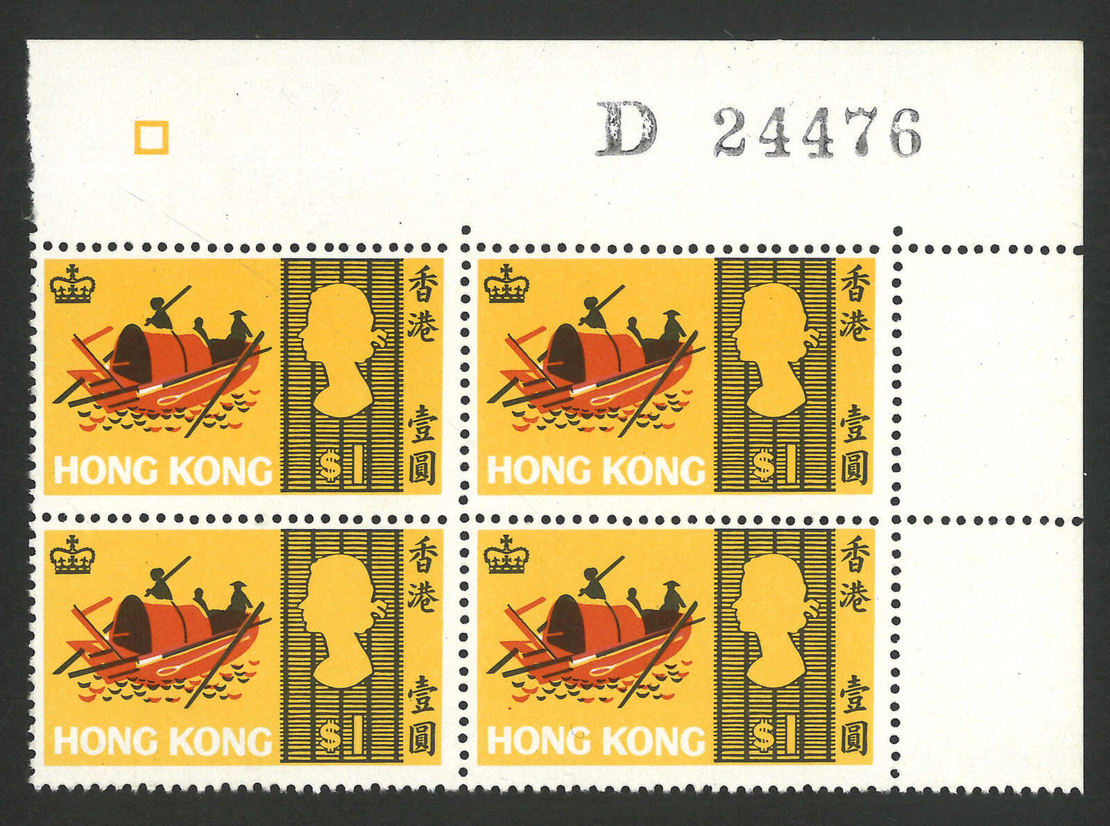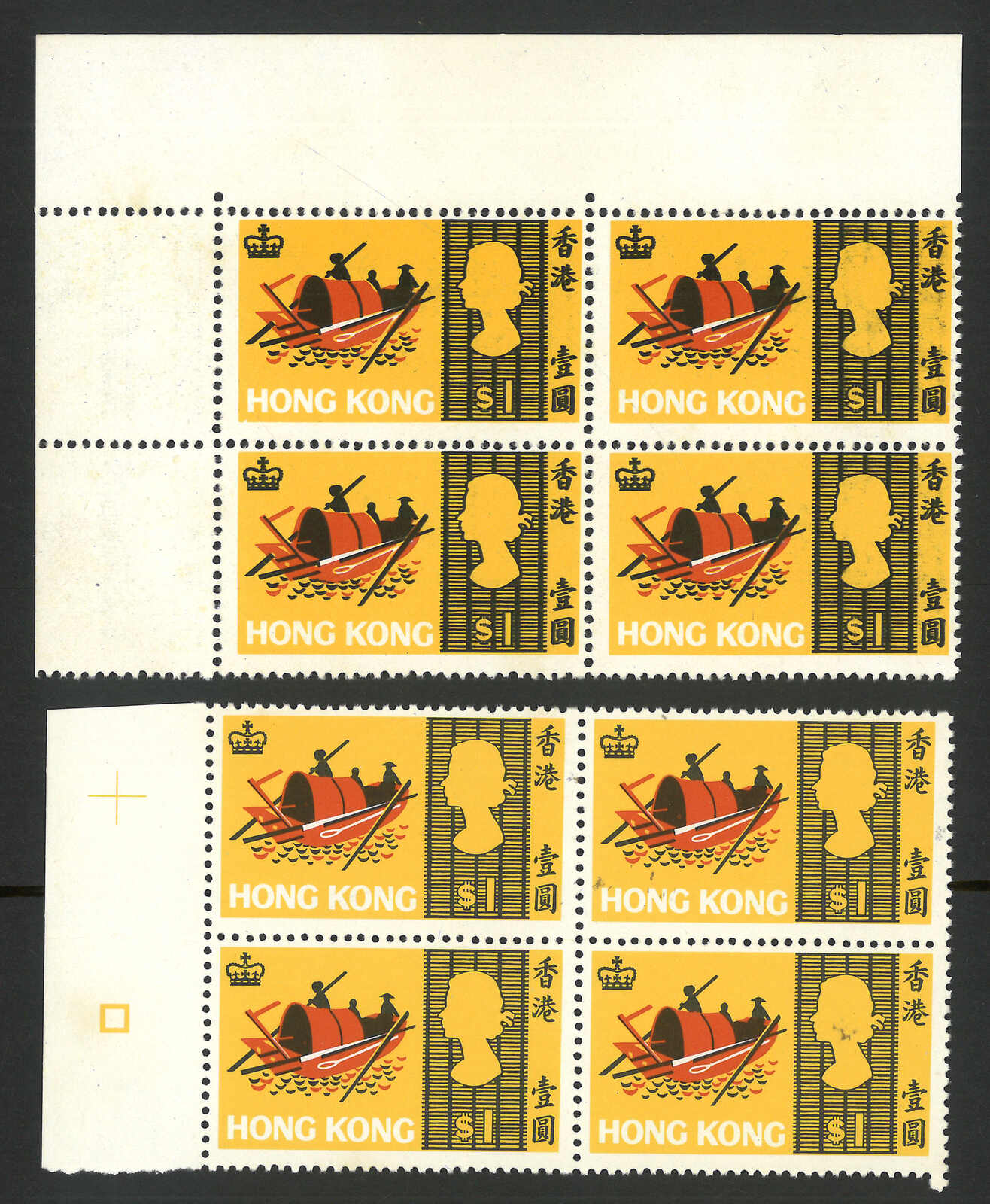 1678 ** image1968 Sea Craft $1 in block of 4, with double impression of black colour variety (Yang C53a). plus a normal block of 4 for reference. MNH. Ex- Lau Kwok Wah (known as “Chopking”).