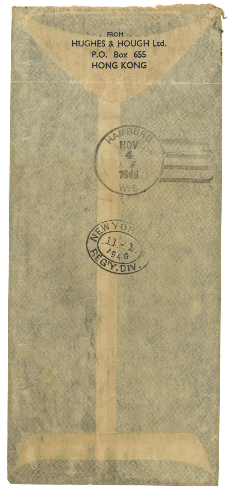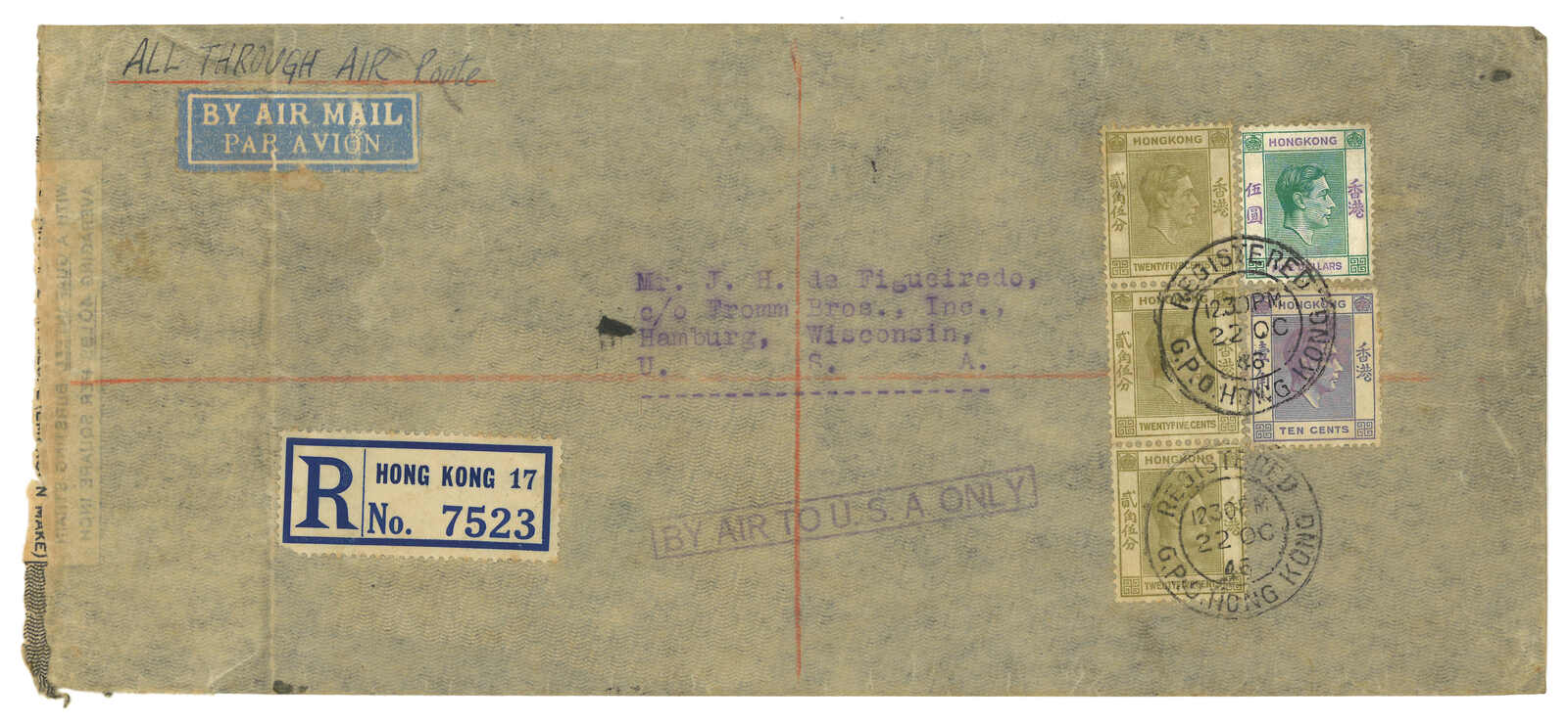 1946.10.22 香港寄美國。航空封,貼香港佐治六世2角5分直三連 + 1角 + 5元,銷總局掛號日戳,另見Proud AM32型“BY AIR TO USA ONLY”橫戳。11.1經紐約。11.4抵Hamburg。此橫戳僅見於1946年9月至11月。(Image 1) (Image 2)