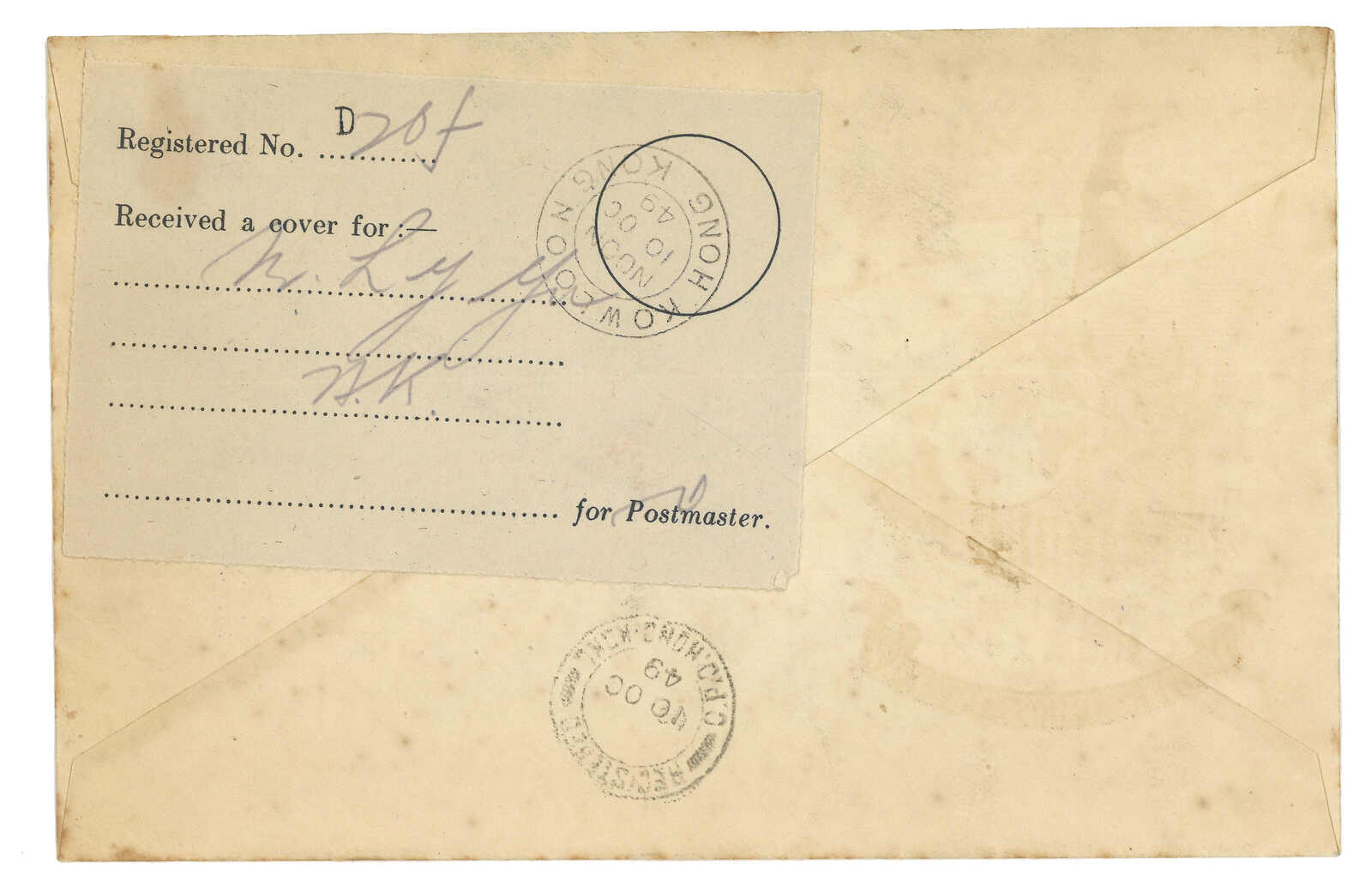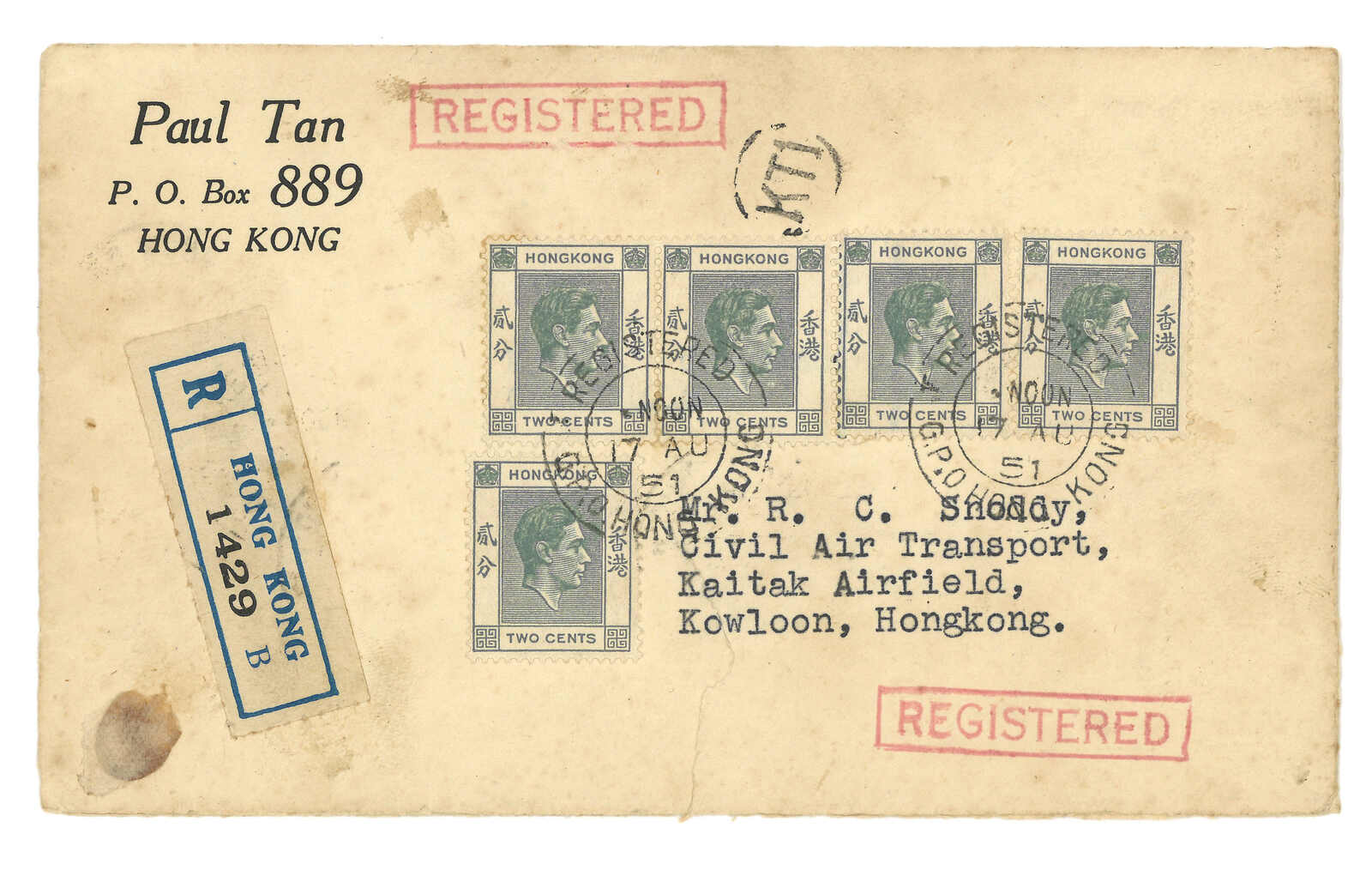 1951.8.17 香港寄九龍啟德機場,正背貼香港佐治六世2分x20,銷總局掛號日戳。另見掛號戳、掛號標籤以及帶圈KT1戳記,應為啟德機場之郵差章,但Proud並無相關記載,難得。(Image 1) (Image 2)