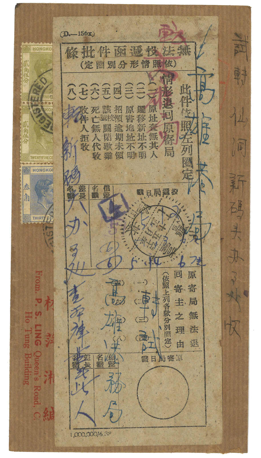 3442 cover image1951 Hong Kong (10 May) to Keelung and returned, f.w. Hong Kong KGVI 25c in pair + 10c + 30c, tied by GPO registered cds, along with airmail and registered label. Transit Taipeh (12 May). Attached with return slip with Keelung (15 May) cds.