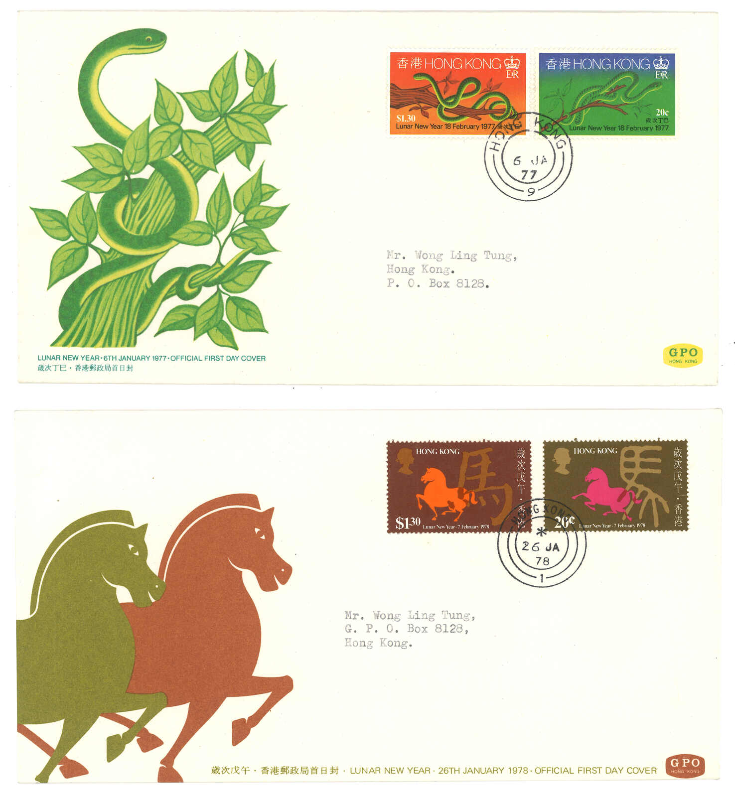1967至1978年香港第一輪生肖票首日封一組十二件,由羊年至馬年齊全。(Image 1) (Image 2) (Image 3) (Image 4)