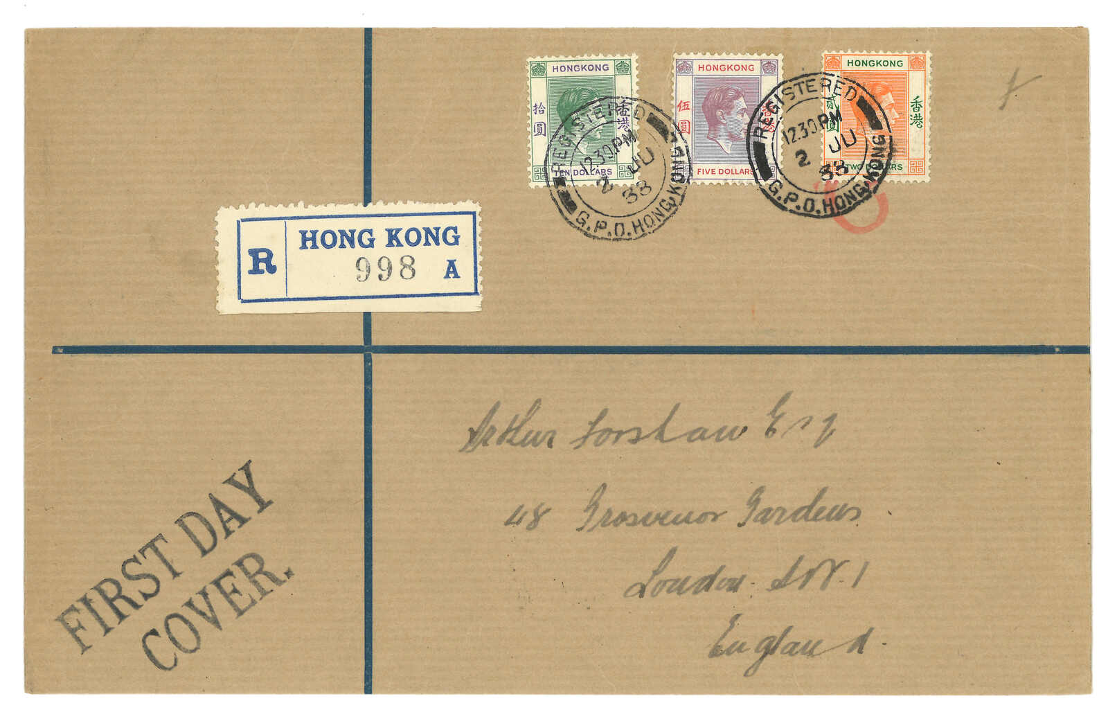1938.6.2 香港佐治六世第一組5元及10元掛號首日封(楊目145-146),寄英國,另貼2元票,銷總局掛號日戳。(Image 1) (Image 2)
