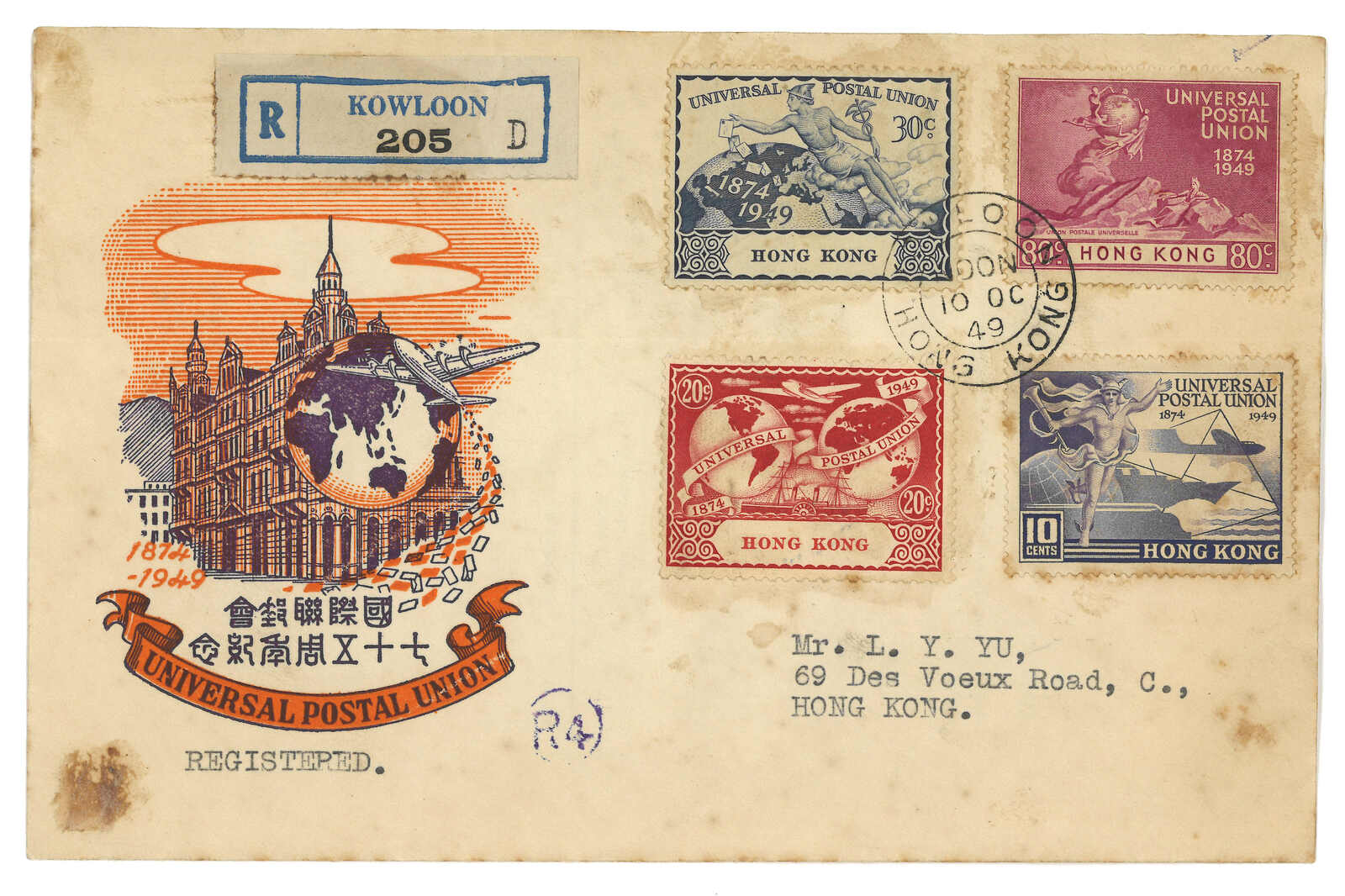 1687 cover image1949 (10 Oct) 75th Anniv of UPU illustrative FDC (Yang C19-22), registered to Hong Kong local, tied by Kowloon Webb type M cds (featuring large K of "KONG"). On reverse with registered slip and Hong Kong GPO (10 Oct) arrival cds.
