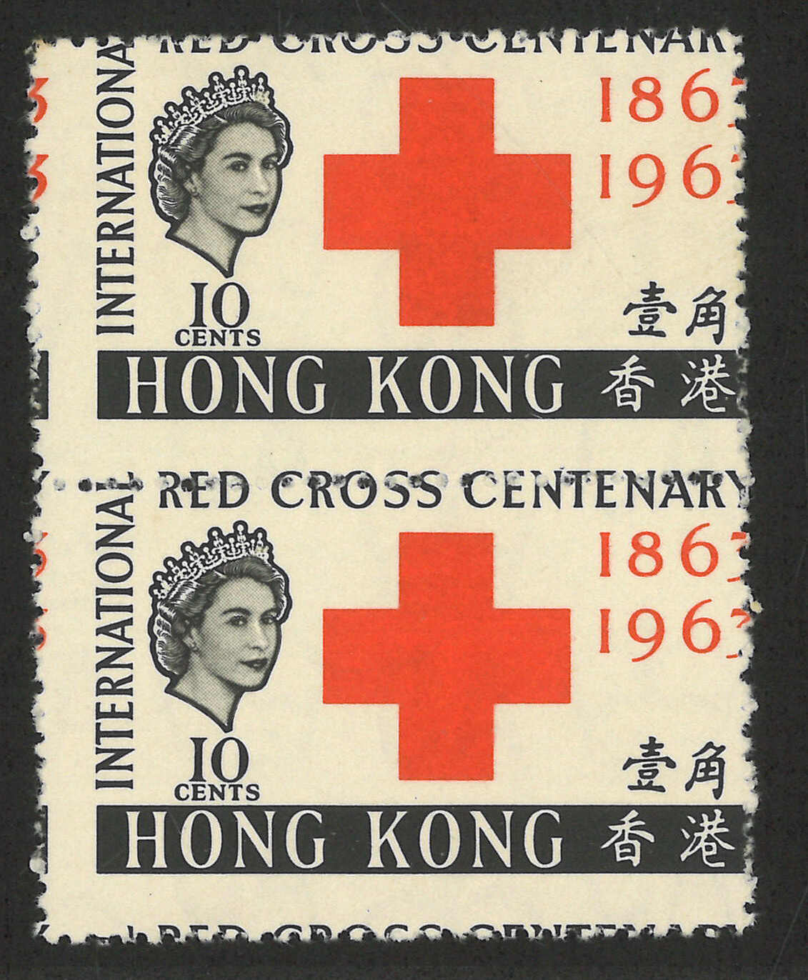 1675 * image1963 Red Cross Centenary 10c in vertical pair, with perf shifted variety (Yang C29), MNH with light toning.