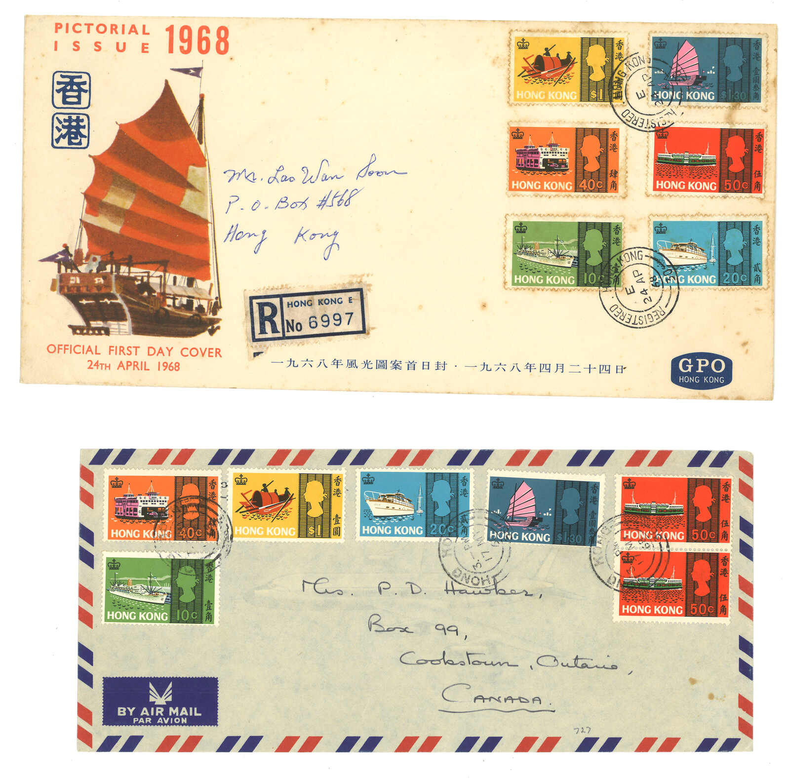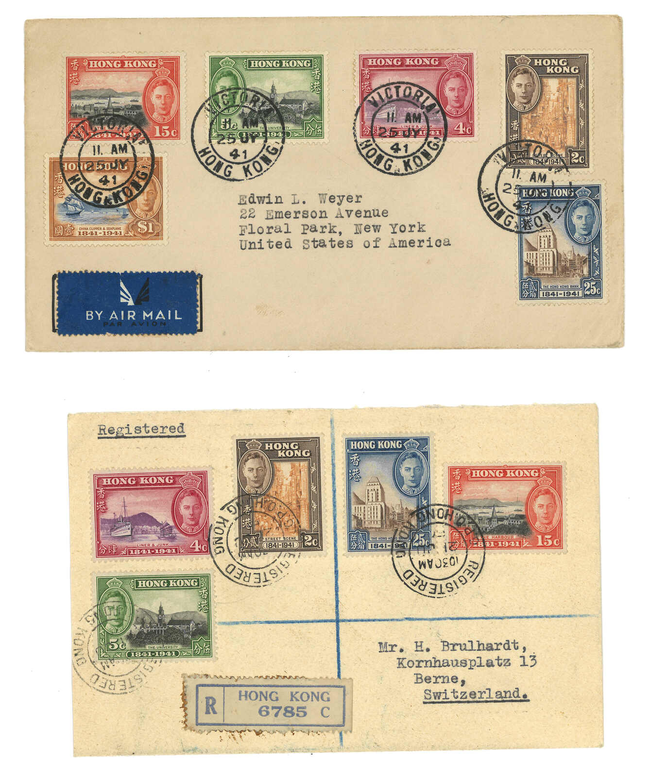 1645 cover image1941 a pair of outgoing registered covers from Hong Kong f.w. Centenary of British Occupation set, tied by Victoria and Hong Kong GPO registered cds respectively.