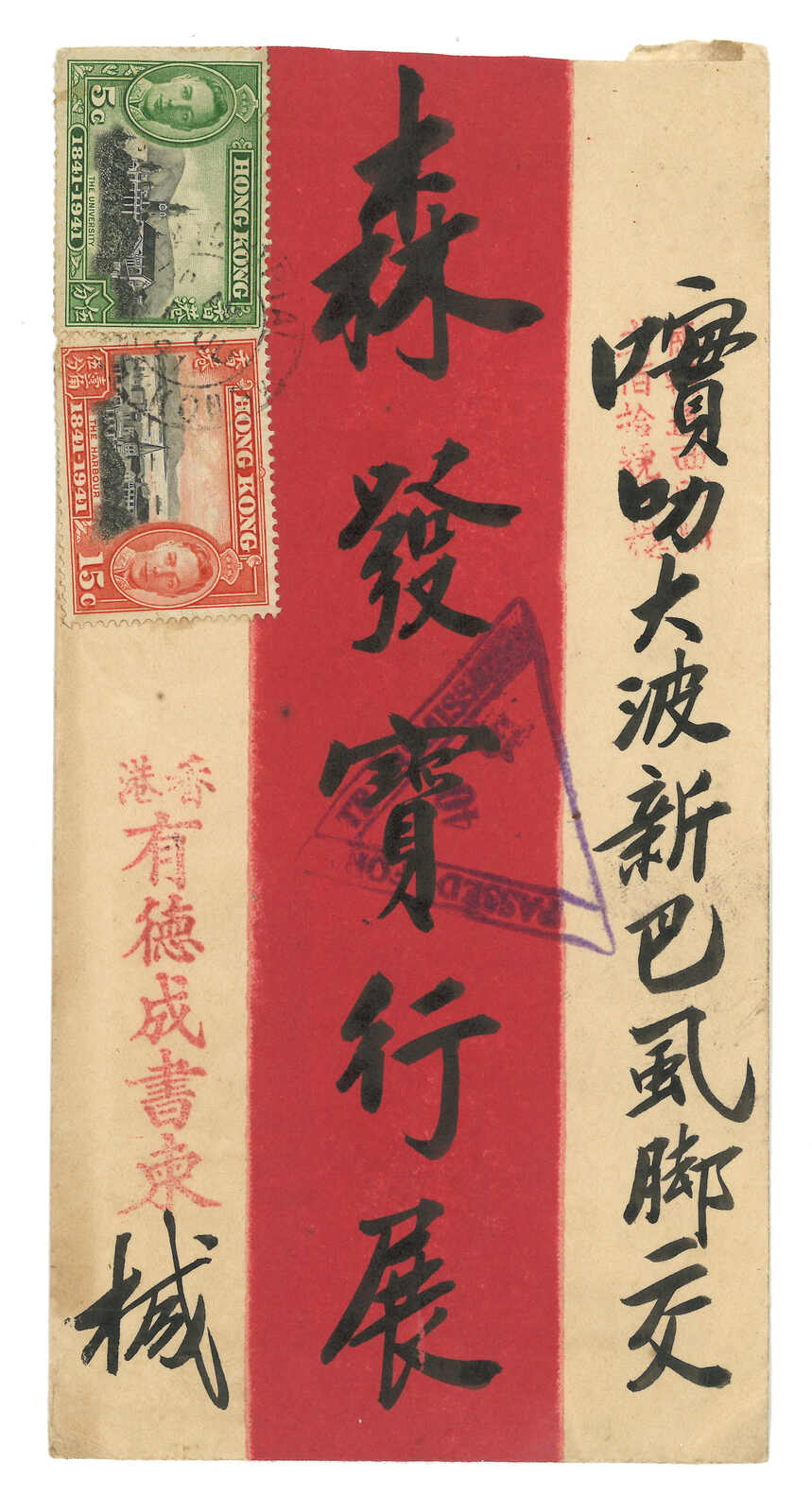 1941.6.13 香港寄新加坡。紅條封,貼開埠百週年5仙 + 15仙,銷維多利亞日戳。另見新加坡“PASSED FOR TRANSMISSION” 40號6C型三角檢查章。附原信。(Image 1) (Image 2) (Image 3)
