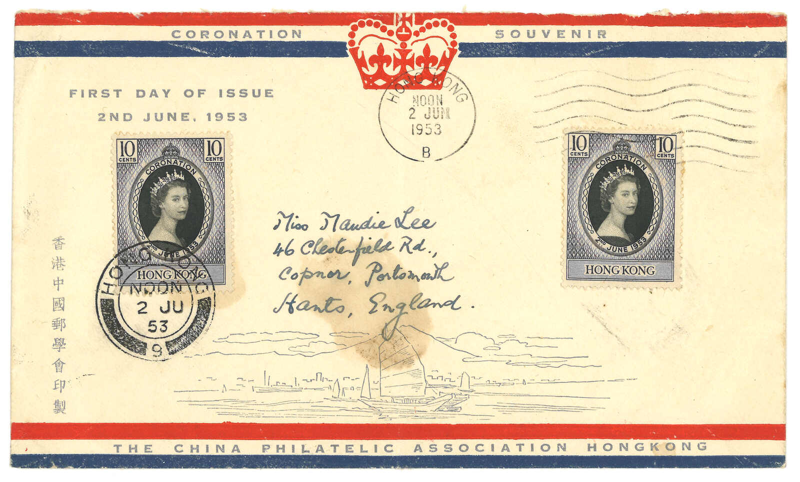 1953.6.2 伊利沙白二世加冕紀念 - 中國郵學會首日封(楊目C23),銷香港首日日戳。(Image 1) (Image 2)