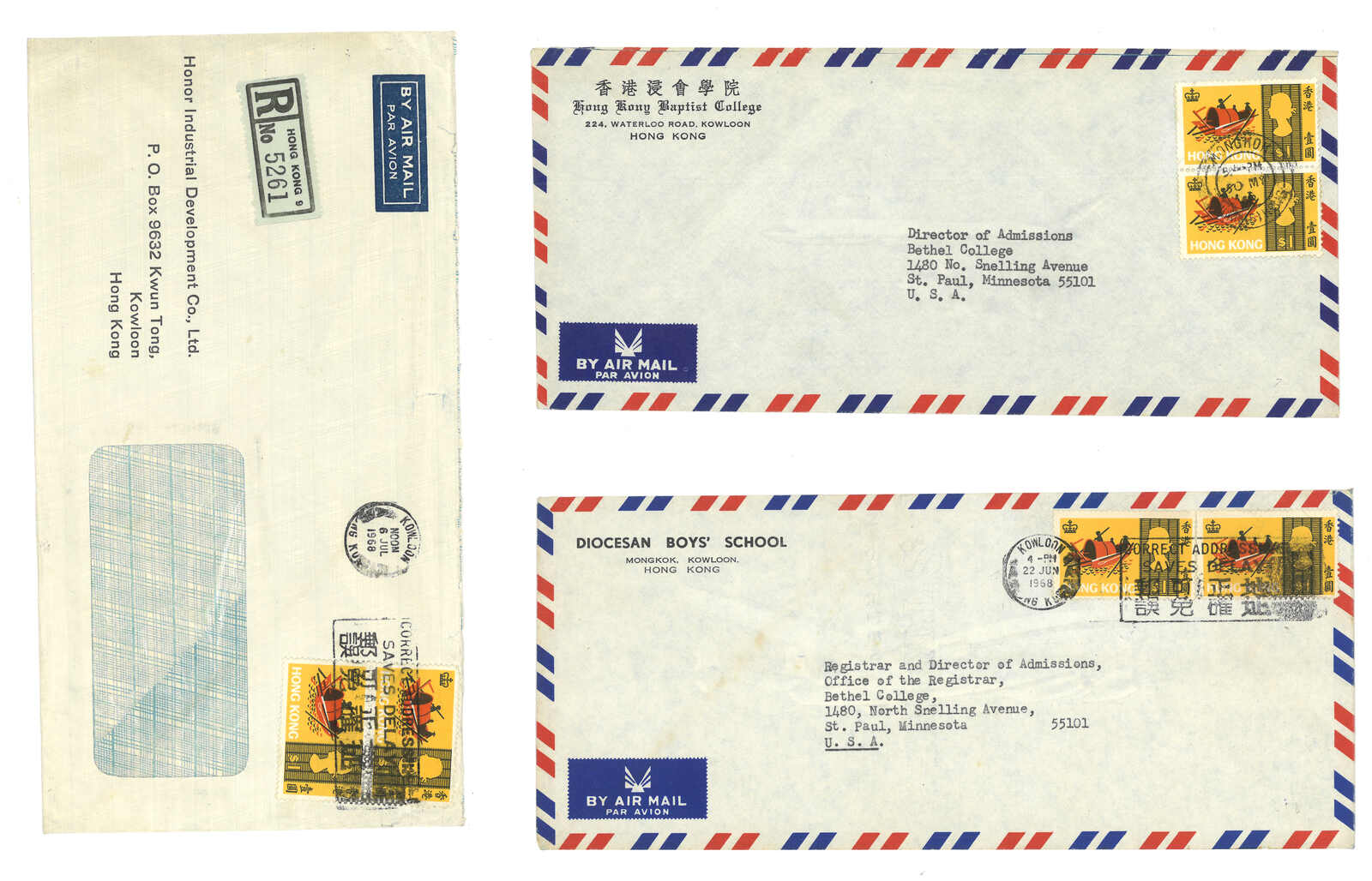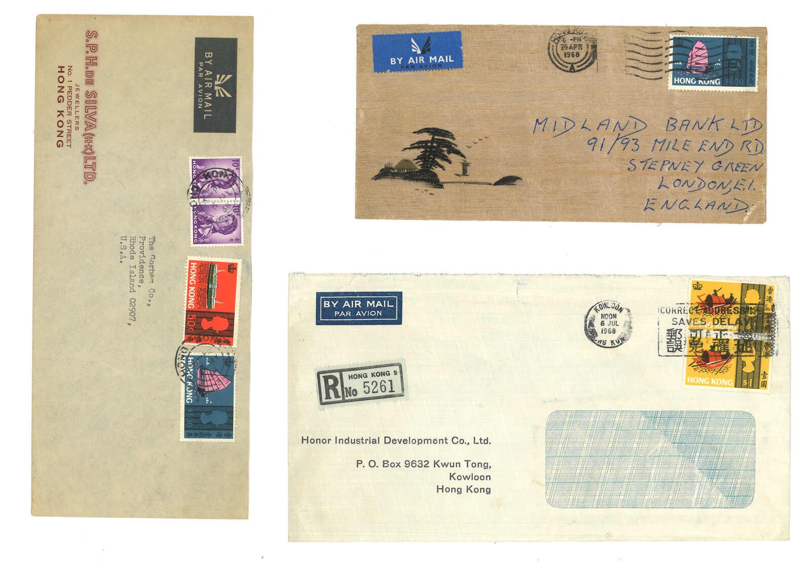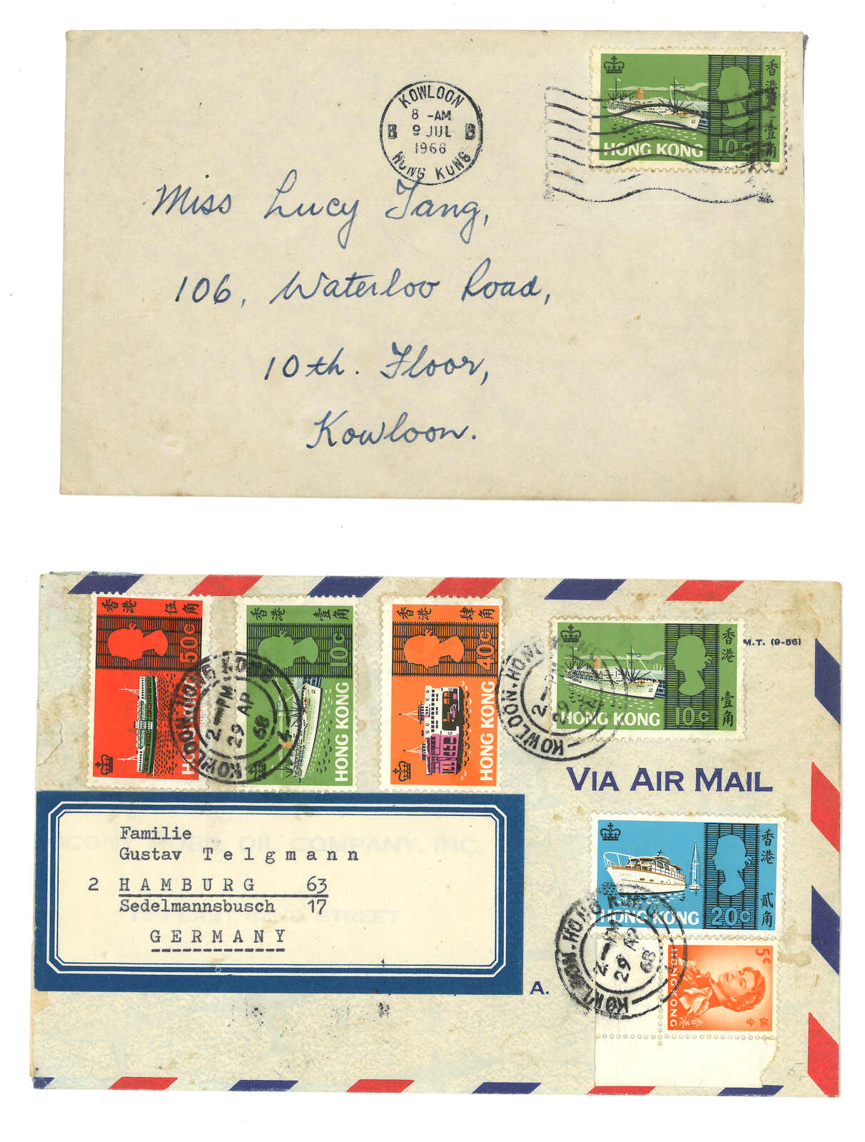 1689 cover image1951 Hong Kong (17 Aug) to Kai Tai Airfield, Kowloon, f.w. Hogn Kong KGVI 2c x20 on both sides, tied by GPO registered cds, along with "REGISTERED" mark, label and circled "KT1" marking, probably postman beat for Kai Tak which Proud did not have record. Scarce.