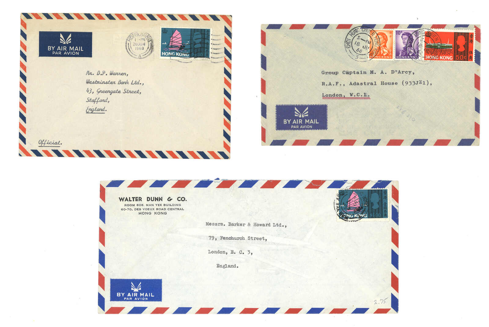 1950年代一組八件貼用香港佐治六世及伊利沙白二世第一版普票之信封,包含印刷品、航空封、首日封等。(Image 1) (Image 2) (Image 3) (Image 4) (Image 5) (Image 6)