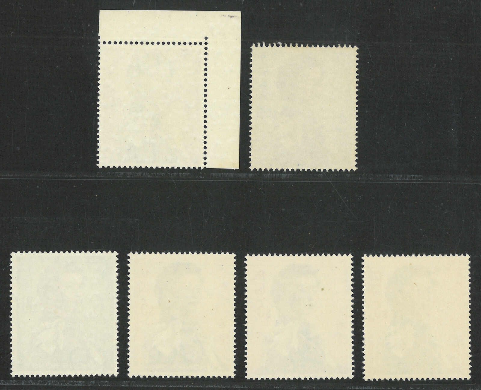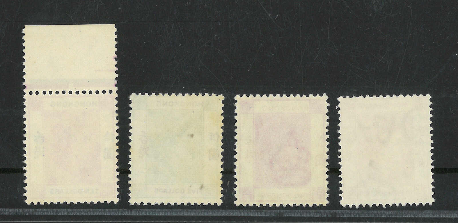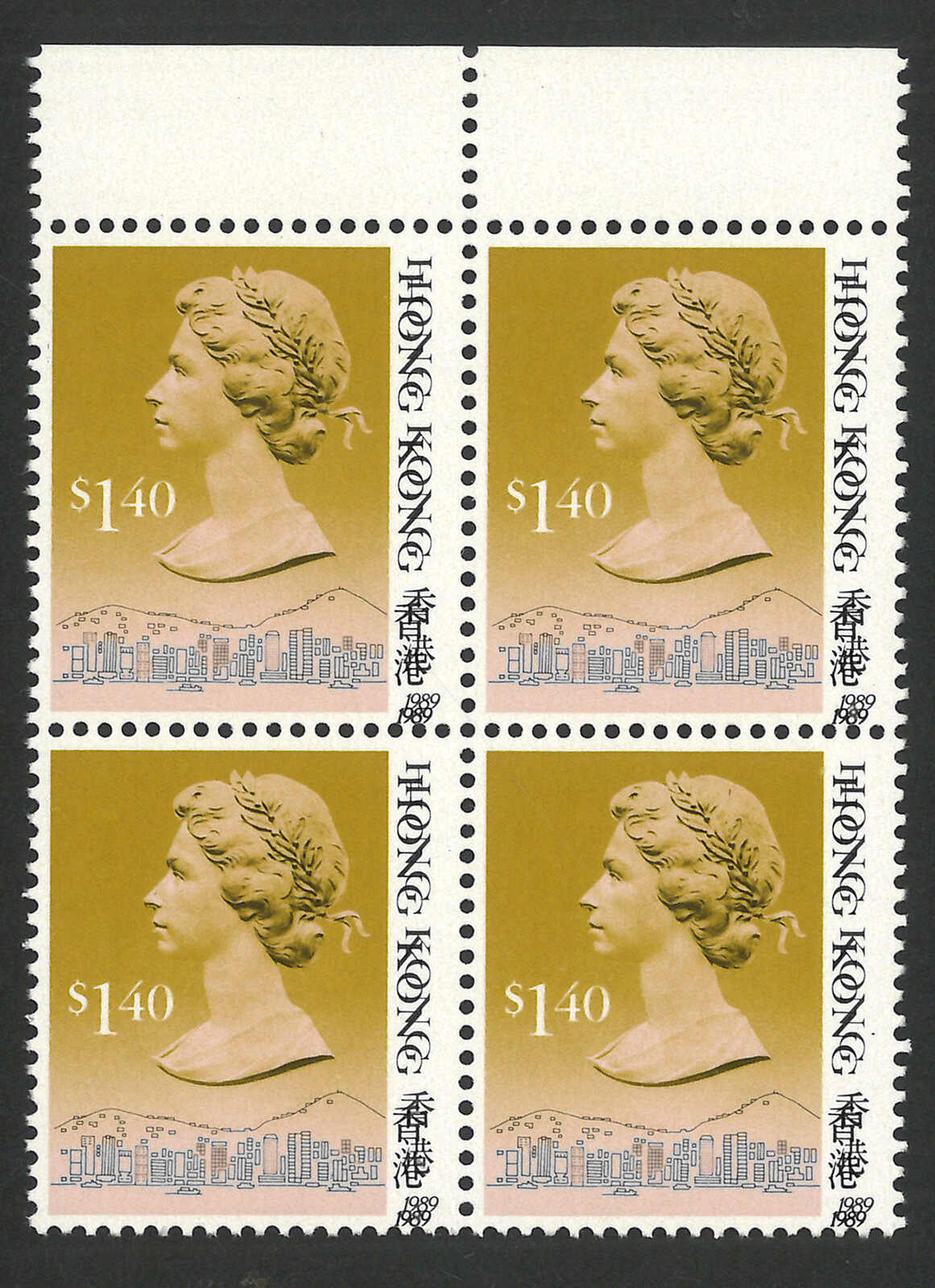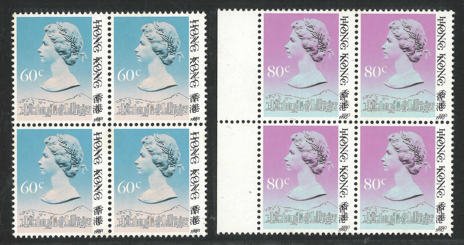 1987至1990年一組七件香港伊麗沙白二世第五組四方連,展示了不同齒孔及複印變異。均為新。(Image 1)