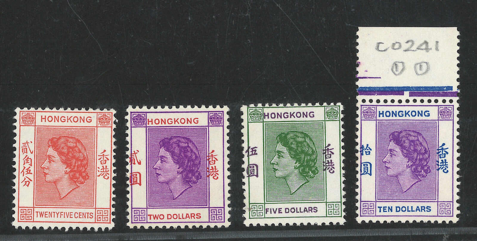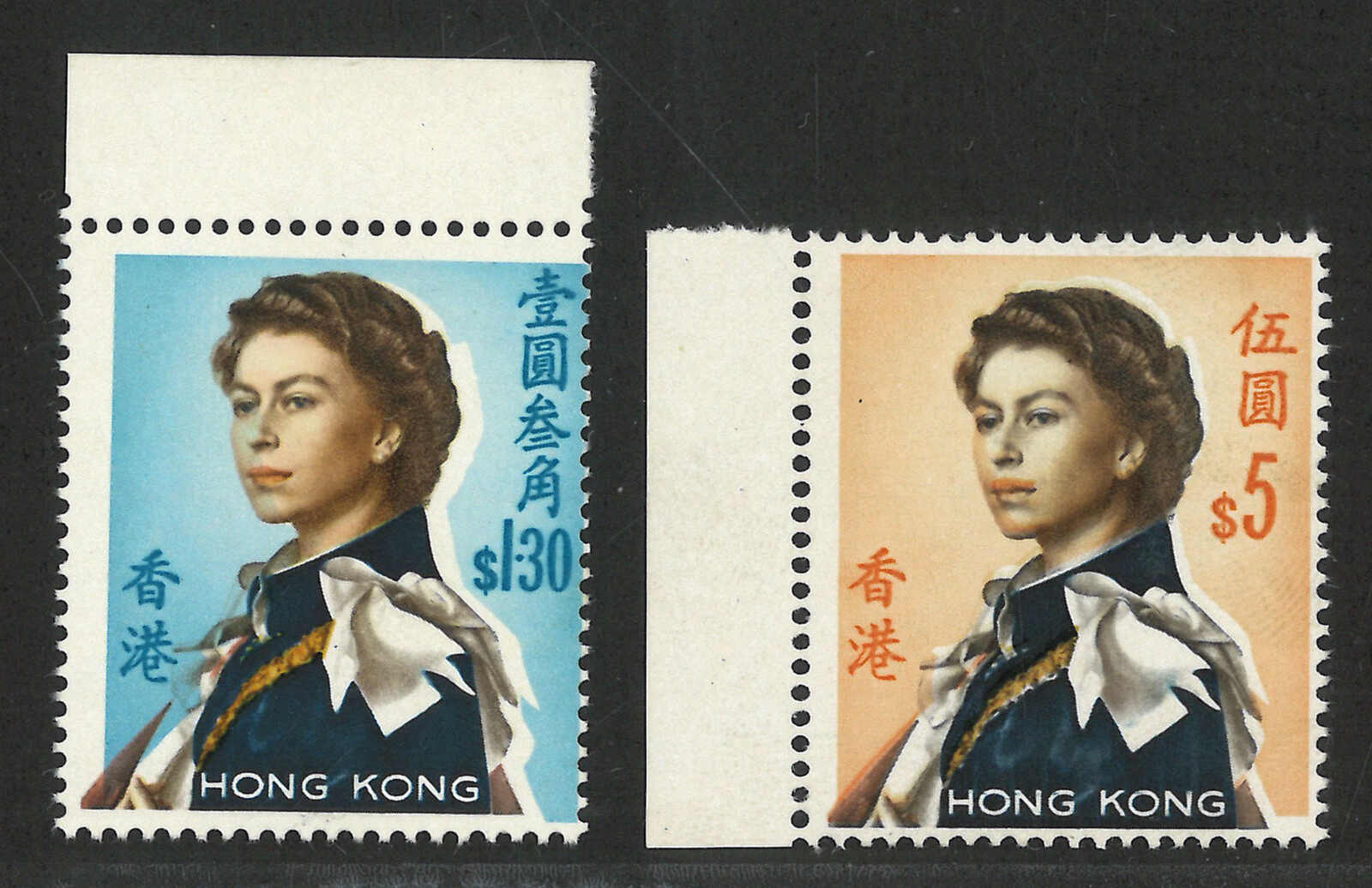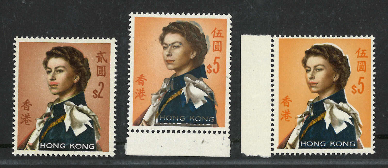 一組3枚香港伊麗沙白二世第二組(軍裝圖)2元及5元變異票,展示了“HONG KONG”或肖像移位變異。均為新。(Image 1)