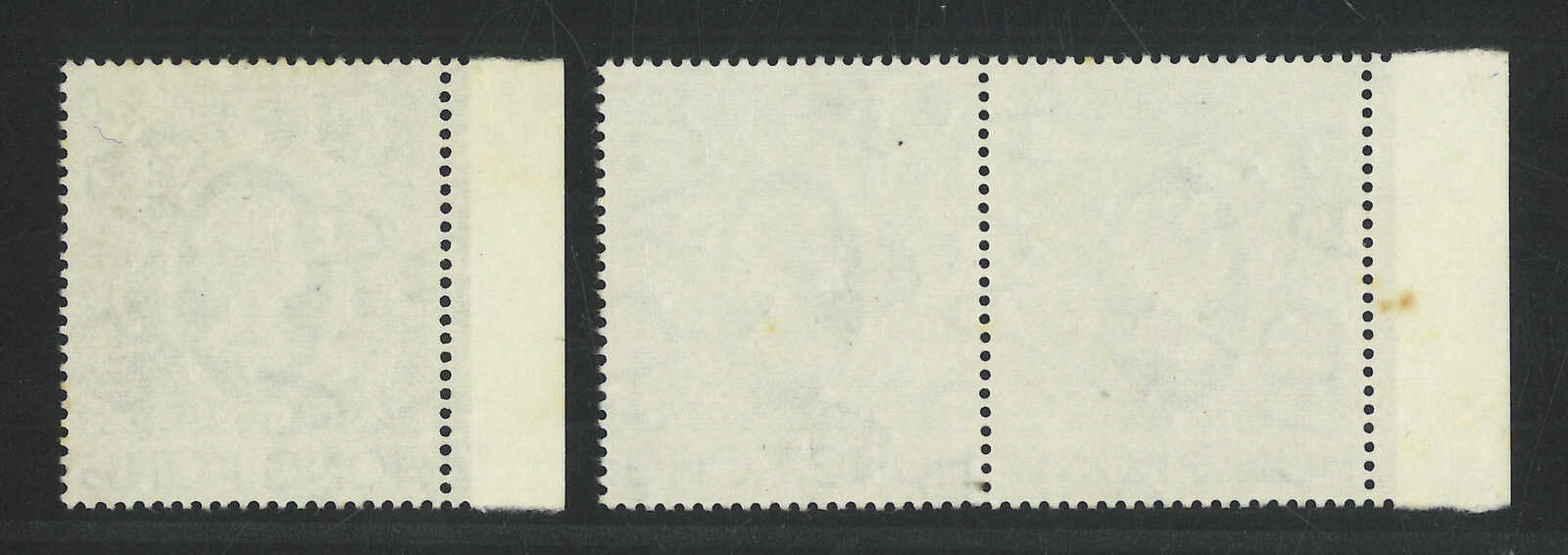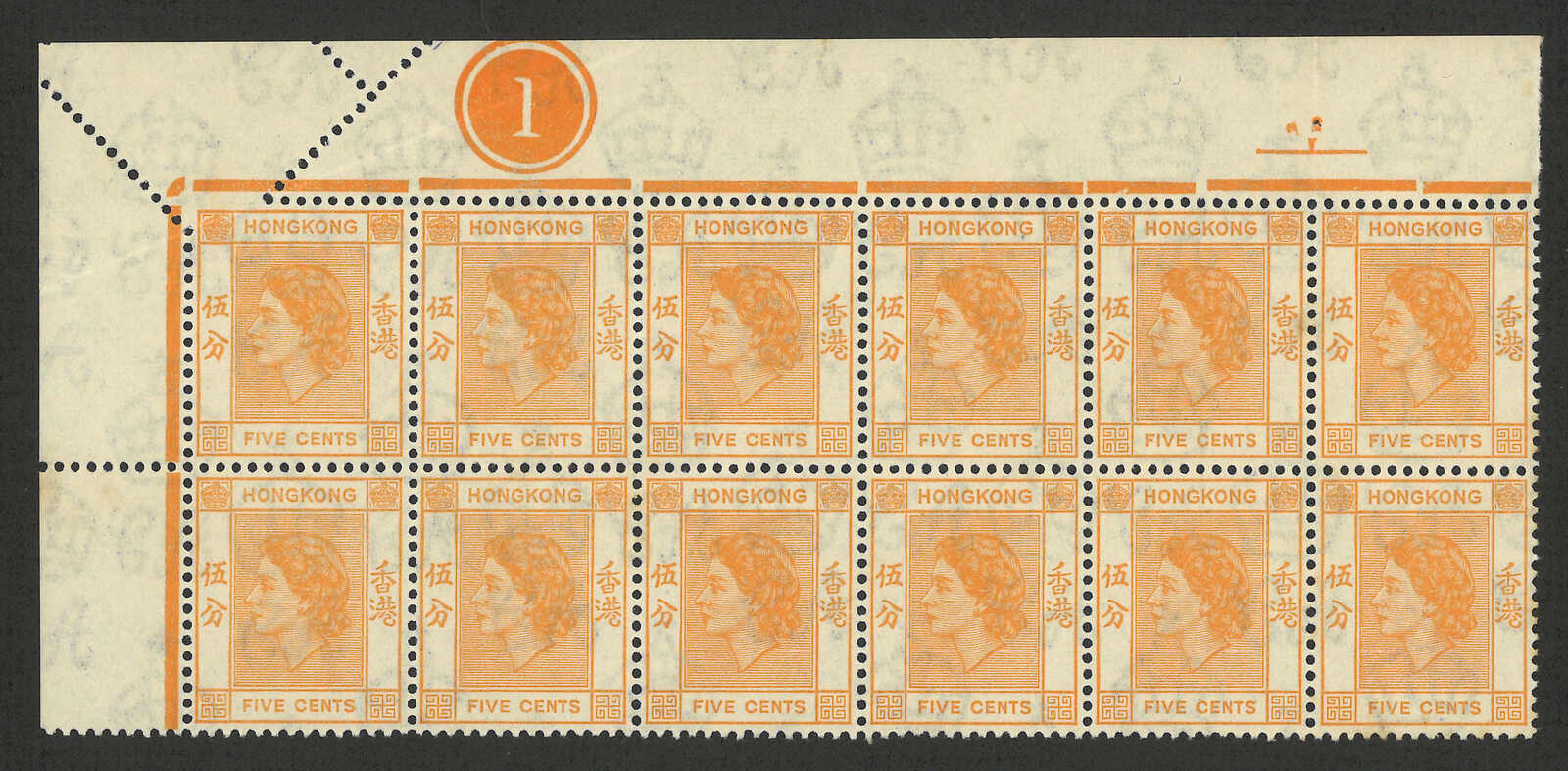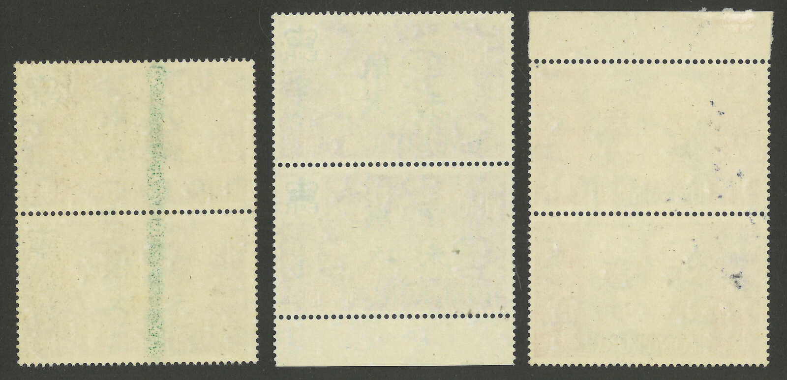 1954年香港伊麗沙白二世第一組5分及5角方連三件,均帶明顯齒孔變異(楊目169、176),均為新。(Image 1)