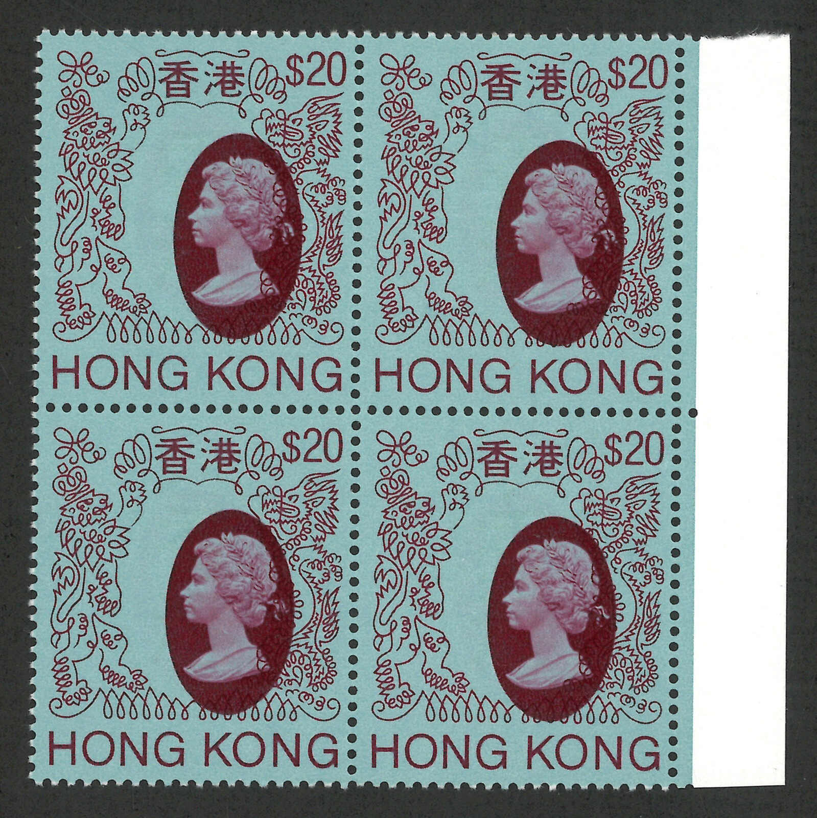 1982年香港伊麗沙白二世第四組第一版有水印20元四方連新,帶肖像移位變異(楊目295 var),原膠無貼。(Image 1)