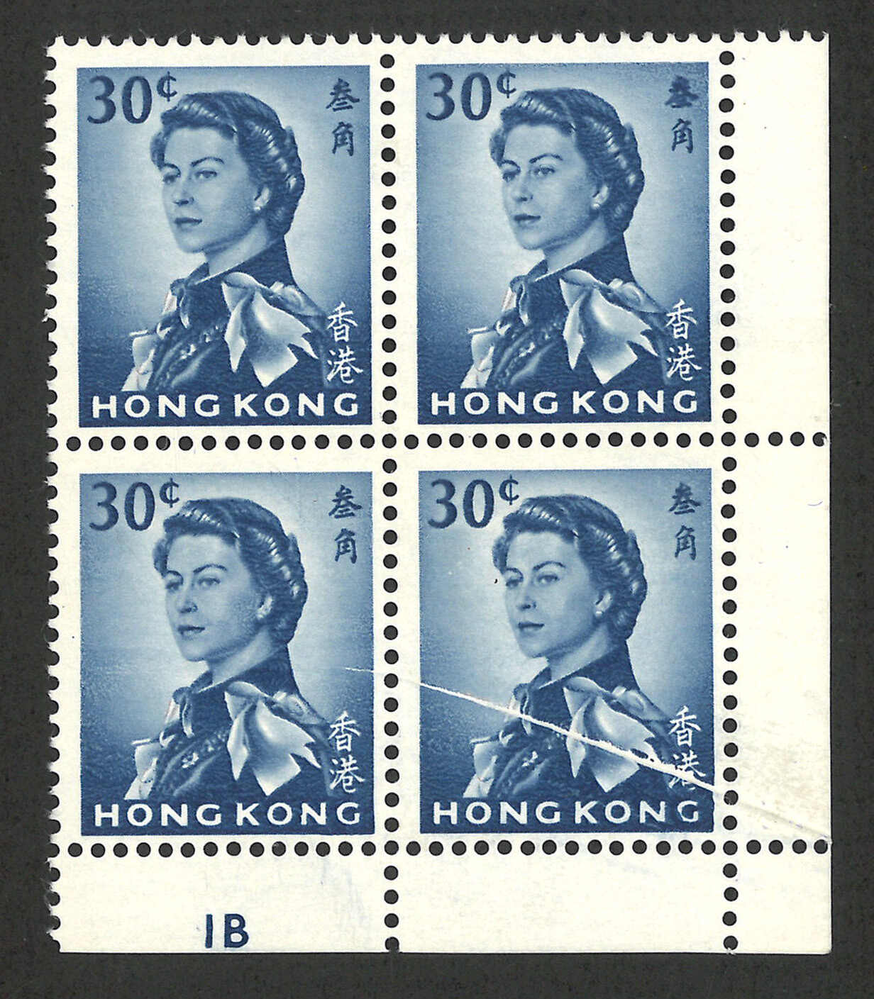 1970-1973 Hong Kong QEII 2nd issue (Annigoni portrait) 30c in corner marginal block of 4, bottom right stamp with paper-folded variety. MNH.