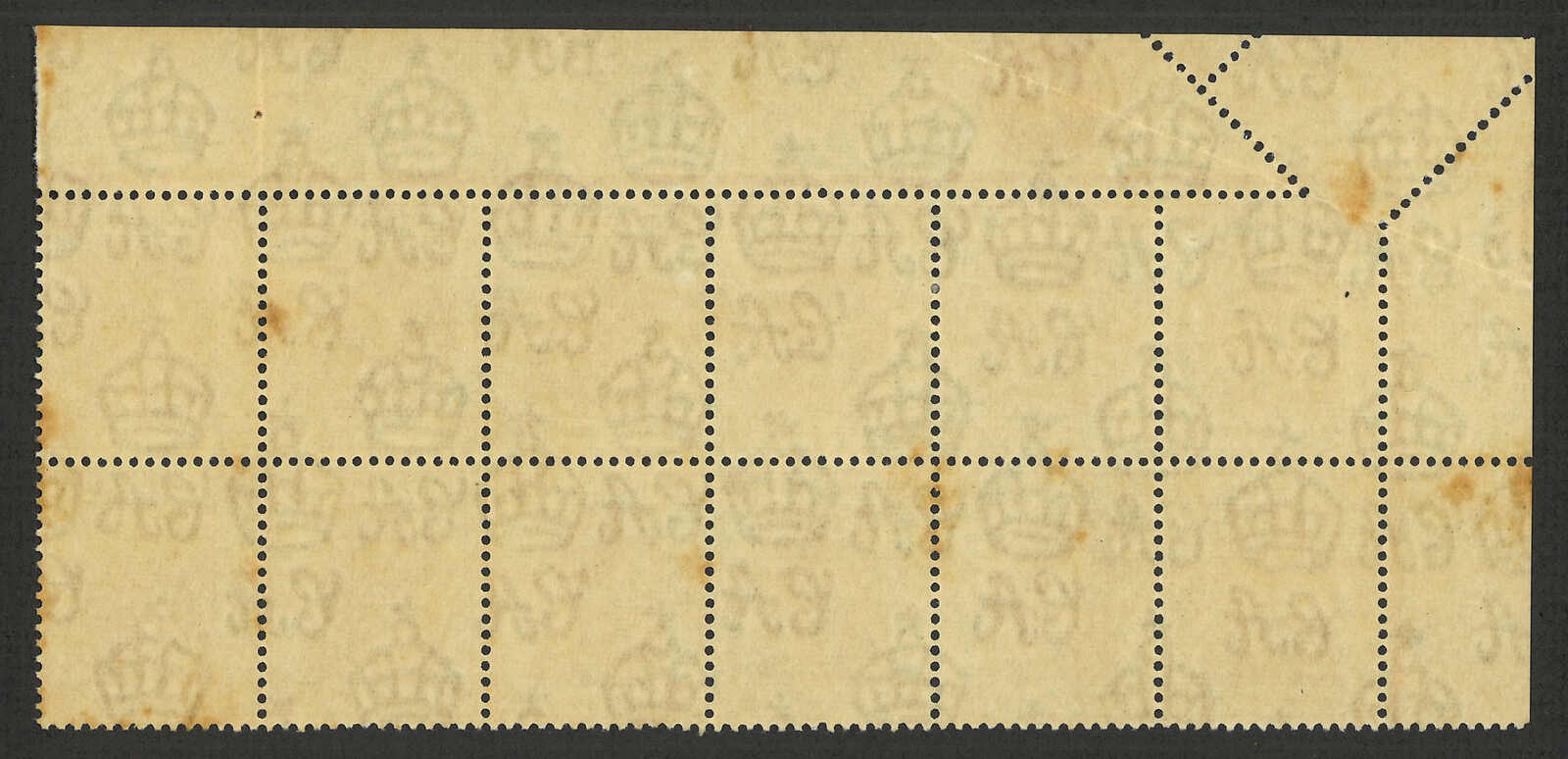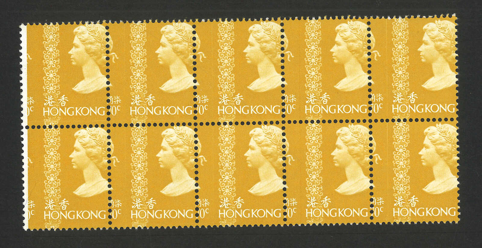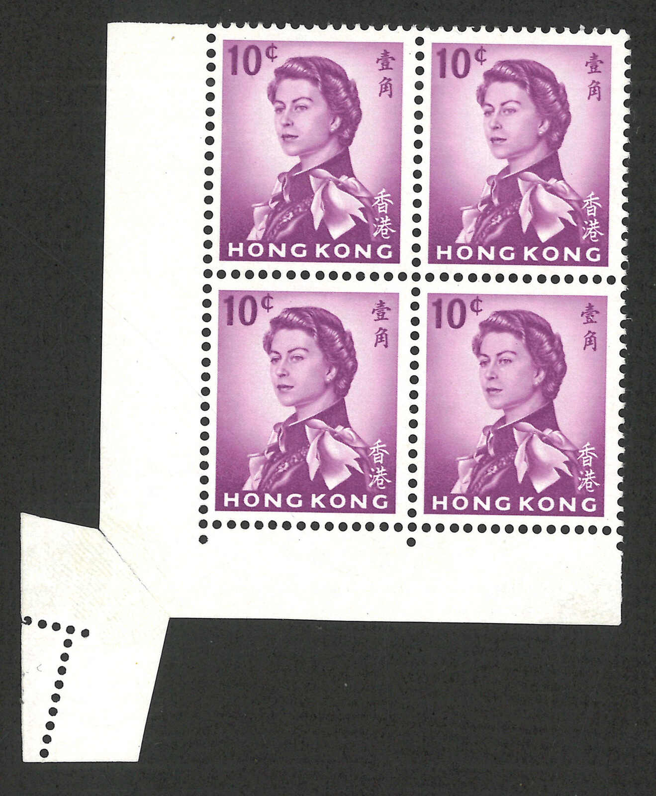 1975至1982年香港伊麗沙白二世第三組7角十方連新,帶齒孔移位變異。(Image