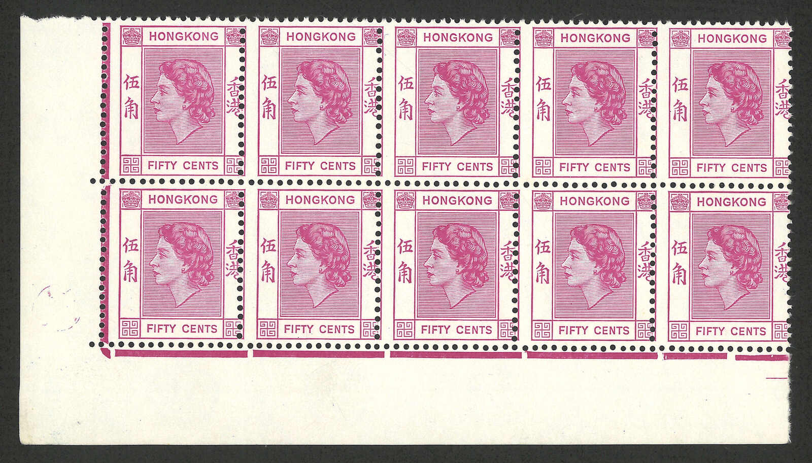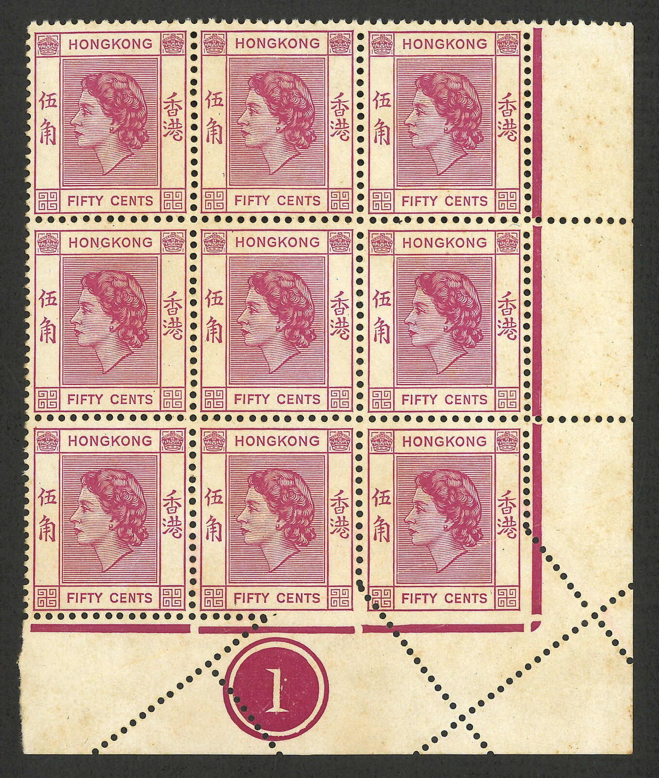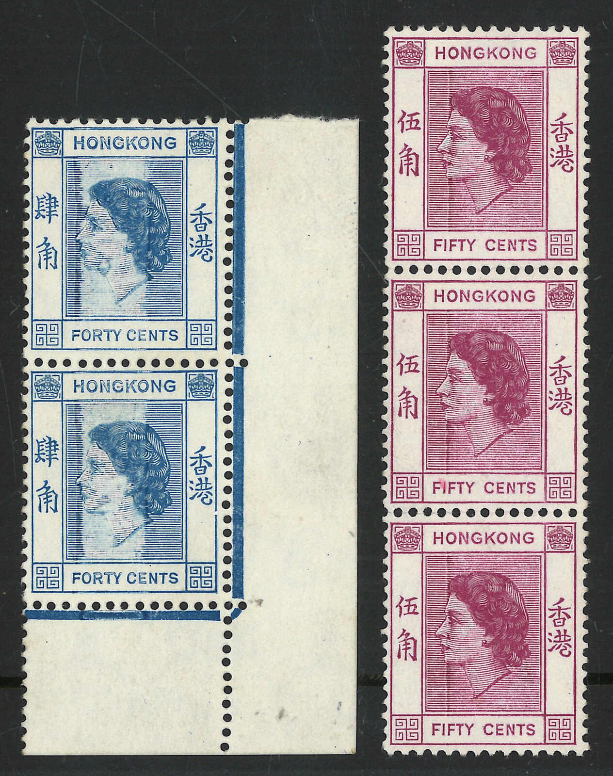 1954 Hong Kong QEII 1st issue 5c and 50c marginal block x3, all with perf varieties (Yang 169, 176), all MNH.