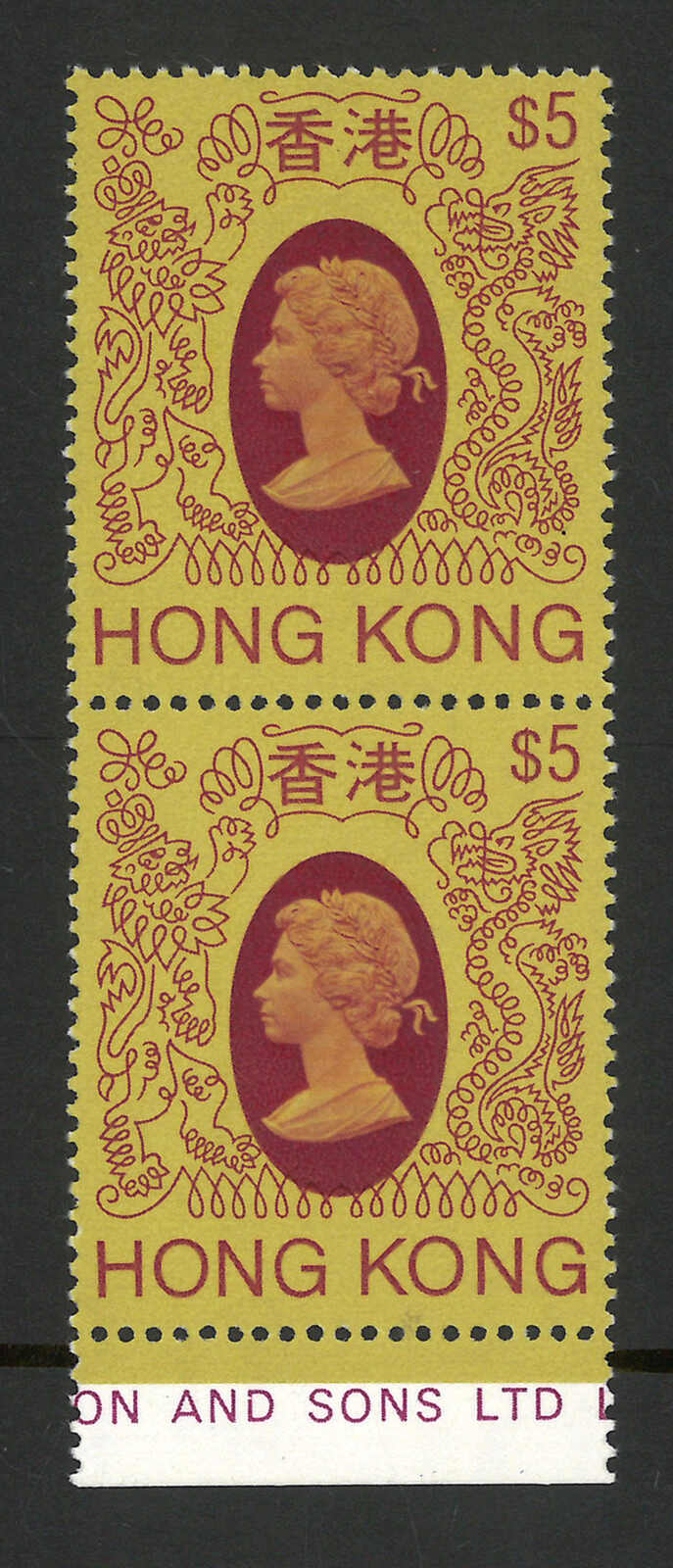 1982-1986 Hong Kong QEII 4th series $5 in vertical pair, with portrait shifted variety.